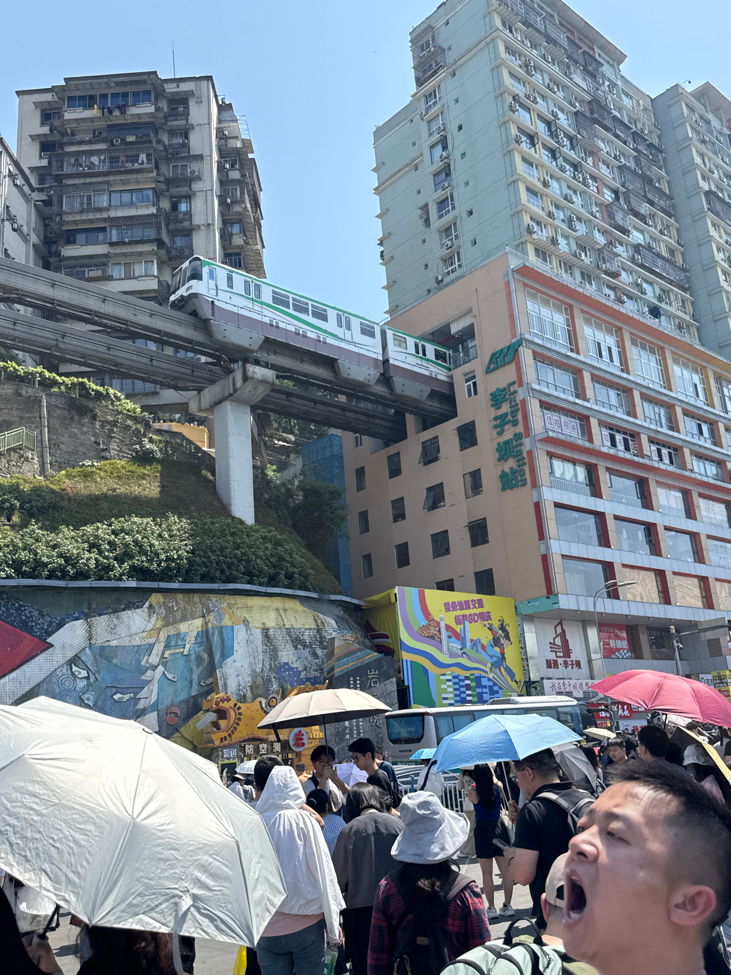 The image depicts Liziba Station in Yuzhong District, China. A passenger train is seen passing through a building. The station sign reads "Liziba Station" in English and Chinese. People are visible, i…read more