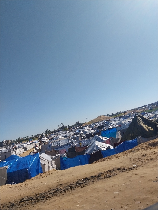 The image displays a vast tent encampment situated on a dry, unpaved, sloping terrain in Deir el-Balah, Palestinian Territory, under a clear, bright blue sky. In the immediate foreground, a wide dirt…read more