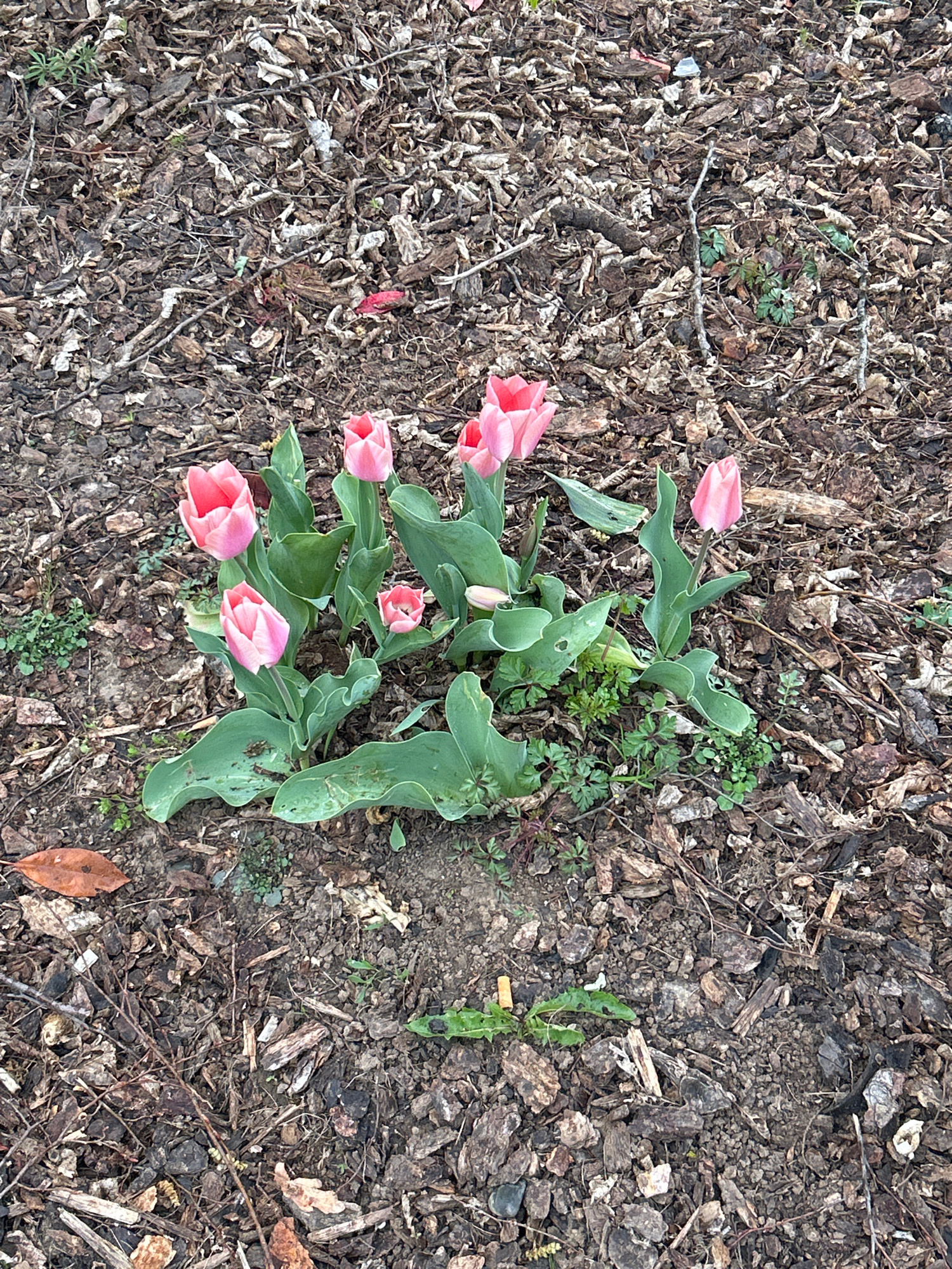 The image presents an overhead view of a patch of ground, predominantly covered with dark brown wood mulch, featuring a cluster of blooming pink tulips. At the center-left, several pink tulips are vi…read more