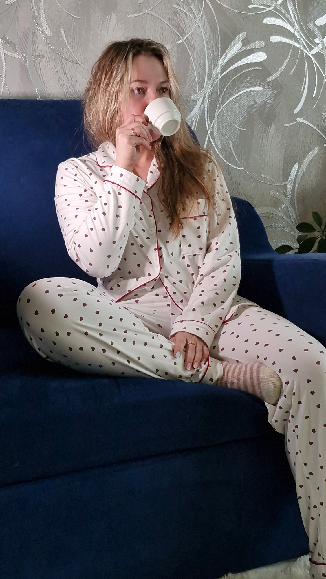 A woman is sitting on a dark blue couch, wearing heart-patterned pajamas and striped socks, and drinking from a white cup. The background features a wall with a silver swirled design and a plant. Theβ¦read more