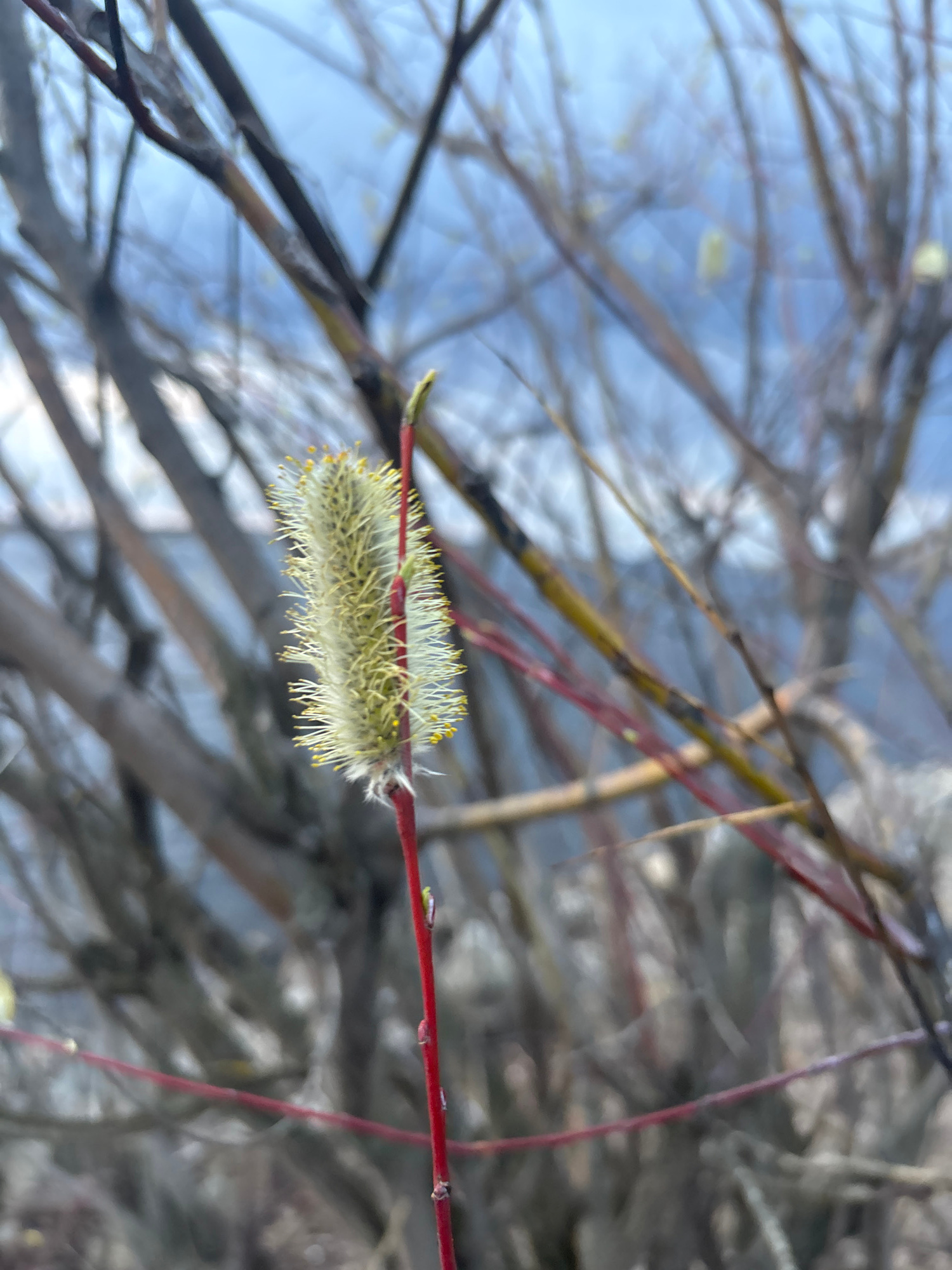 The image shows a close-up of a budding willow branch with a prominent, fuzzy, yellowish-green catkin. The branch is red, and other branches, slightly out of focus, are visible in the background again…read more