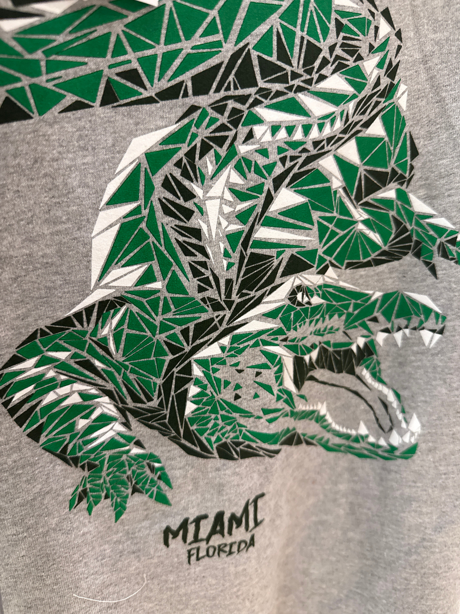 The image shows a gray T-shirt with a geometric design of a reptile, possibly an alligator or crocodile. The design is composed of small triangles in green, black, and white. To the right of the repti…read more