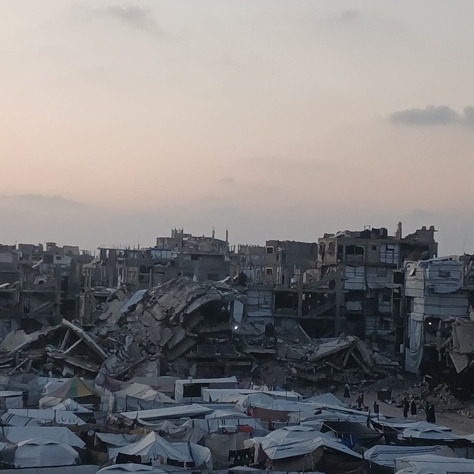 The image shows widespread destruction in an urban environment, likely in Gaza, Palestinian Territory. Numerous buildings are reduced to rubble, and a makeshift camp of white tents is visible in the f…read more