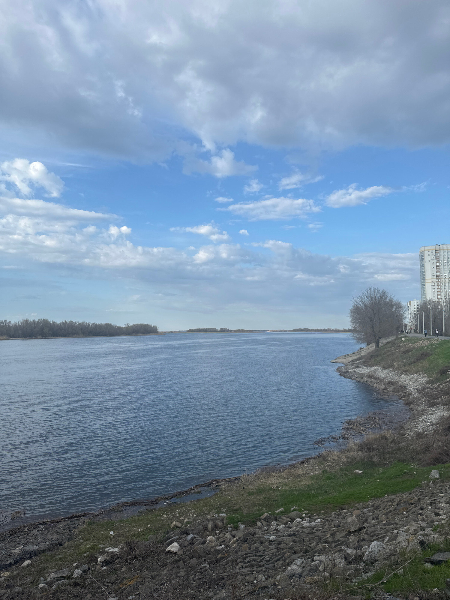 The image shows a body of water, likely a river or large canal, running vertically through the frame. The sky occupies the left portion of the image, displaying a mix of blue sky with white clouds and…read more