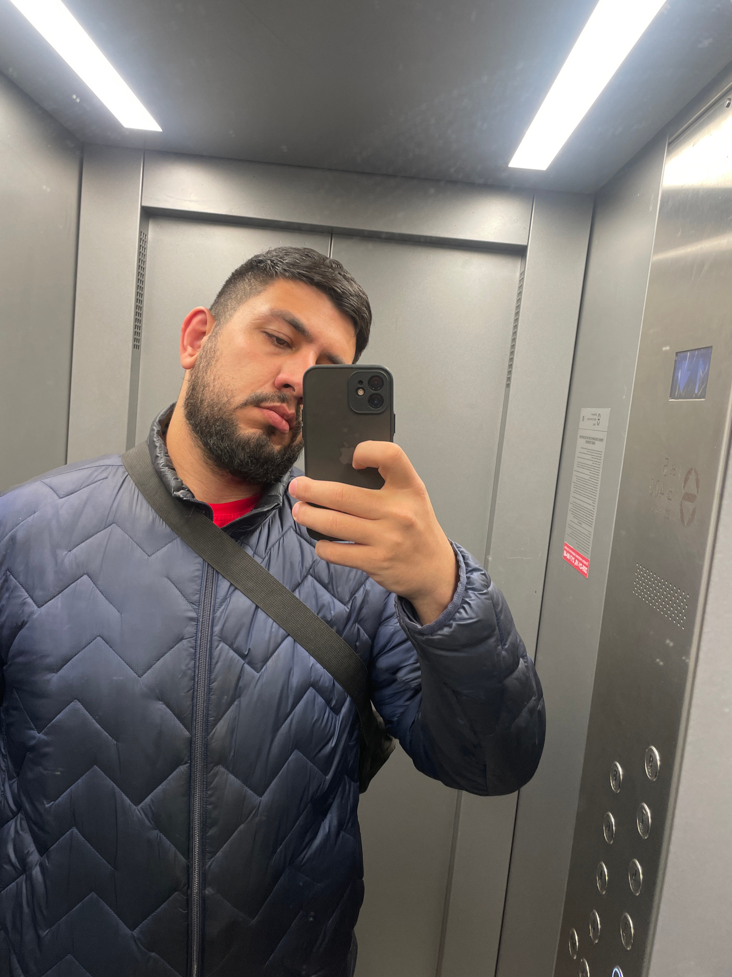 The image shows a man taking a selfie in an elevator. He is holding a black iPhone with two cameras. He has dark hair, a beard, and is wearing a navy blue quilted jacket. A black strap crosses his che…read more