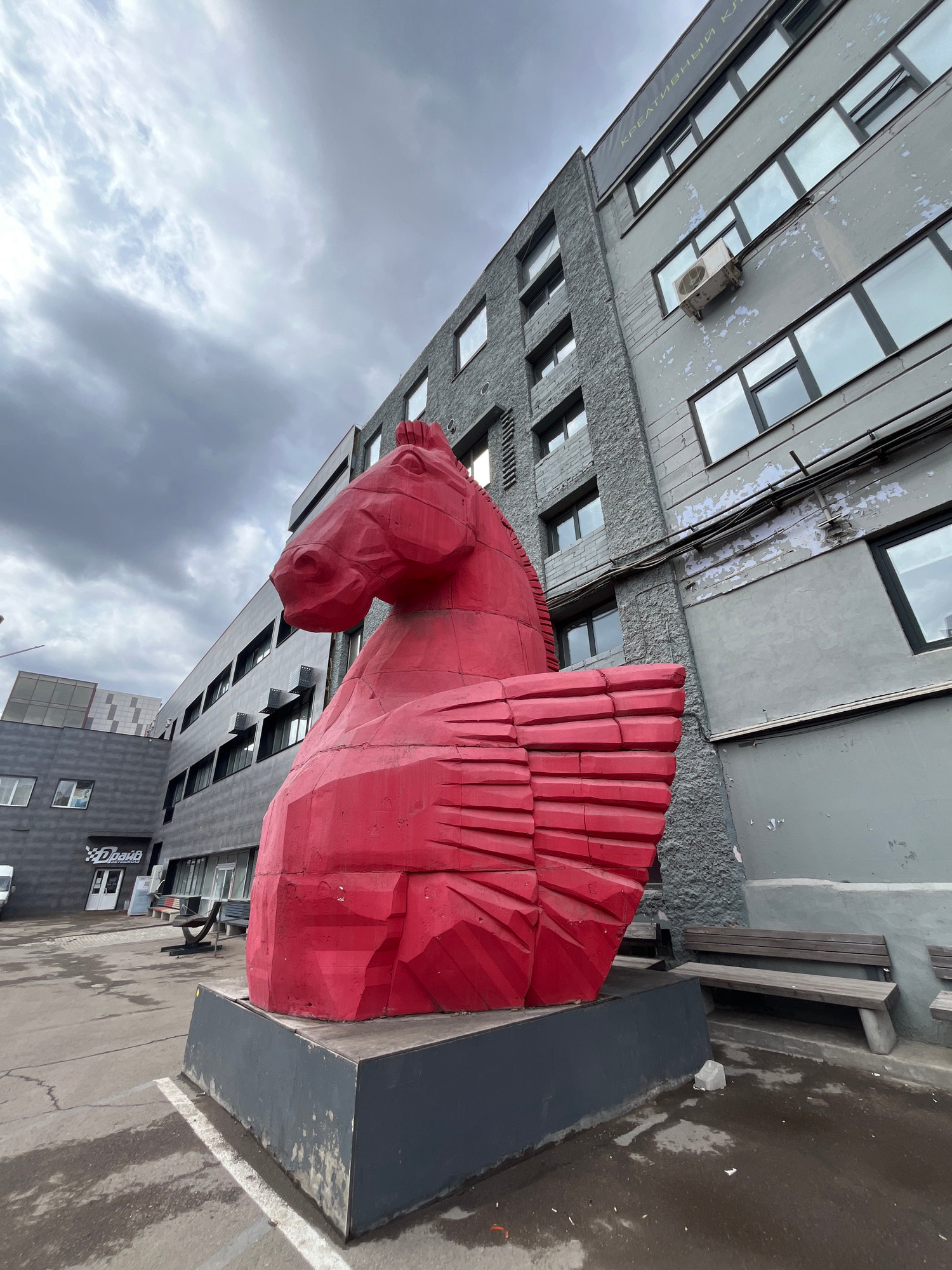 A large red sculpture of a horse with wings stands in front of buildings in Krasnoyarsk, Russia. The sky is overcast. The sculpture is on a gray base. The buildings are gray with windows. The street iā¦read more