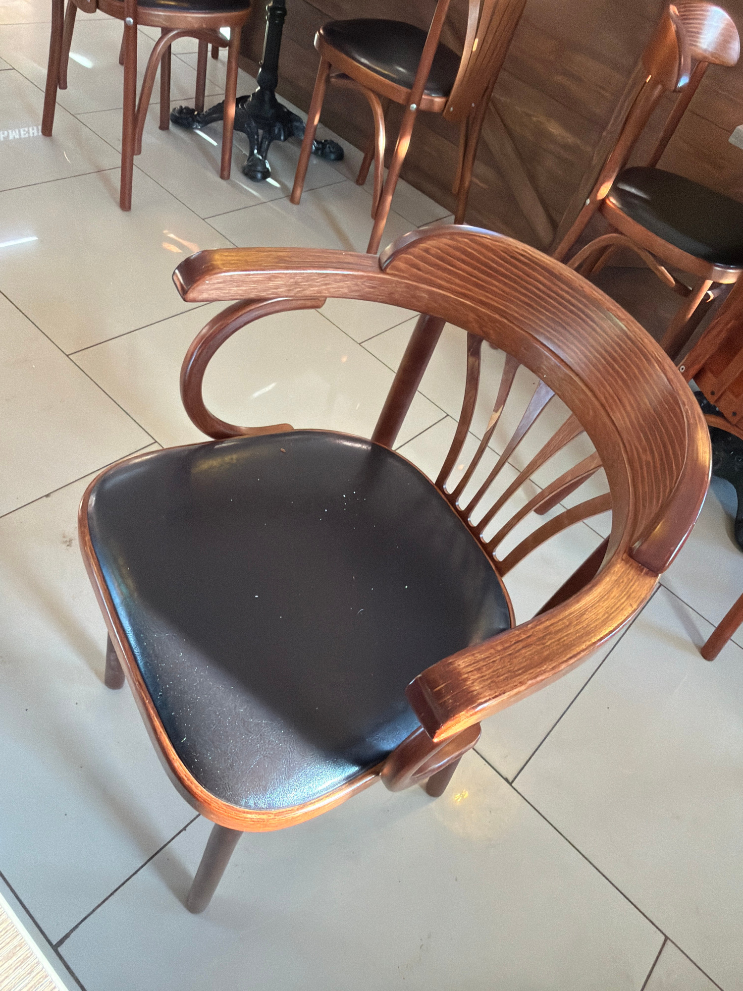 The image depicts a close-up, high-angle shot of a wooden chair with a dark seat. The chair is positioned on a light-colored tiled floor with visible grout lines. The chair is part of a set arranged a…read more