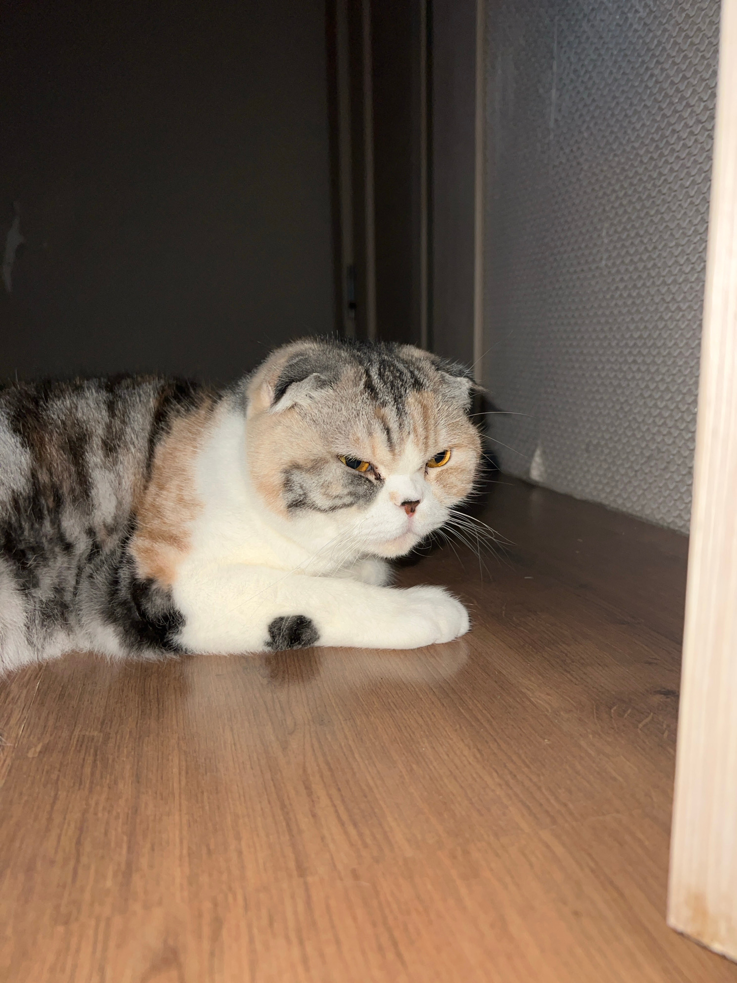 A Scottish Fold cat is lying on a wooden surface. The cat is facing towards the upper right of the frame. The top edge of the wooden surface is visible at the top of the frame. A gray surface is visib…read more