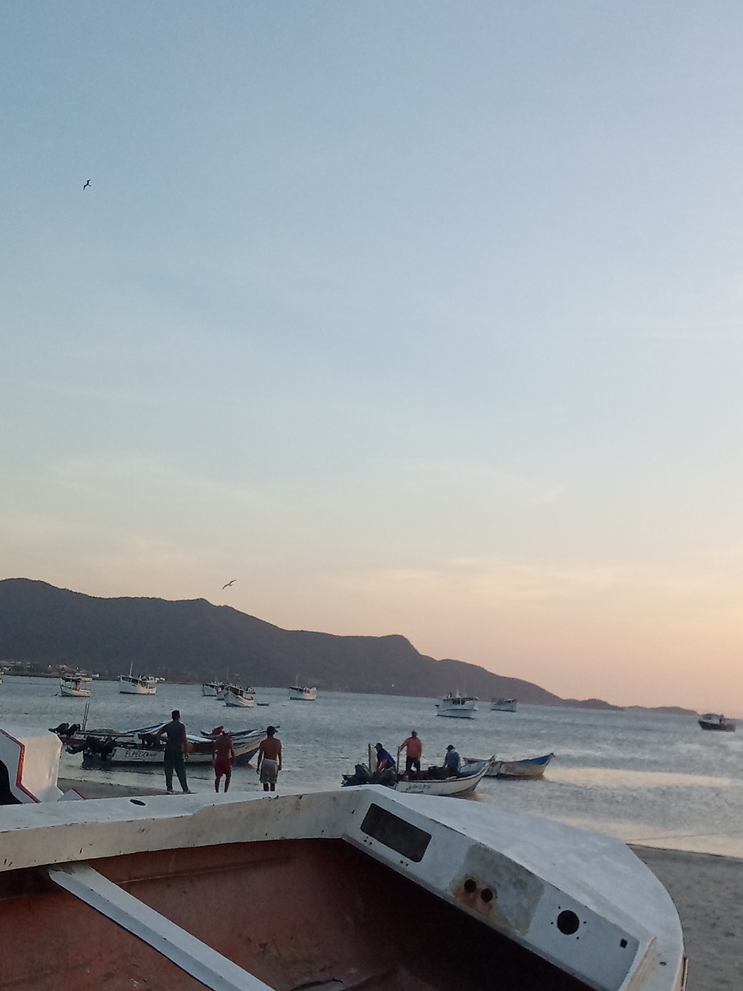 The image depicts a coastal scene in Juan Griego, Venezuela, at what appears to be dusk. The sky exhibits a gradient from light blue to a warm orange-pink hue near the horizon. A mountain range is sil…read more