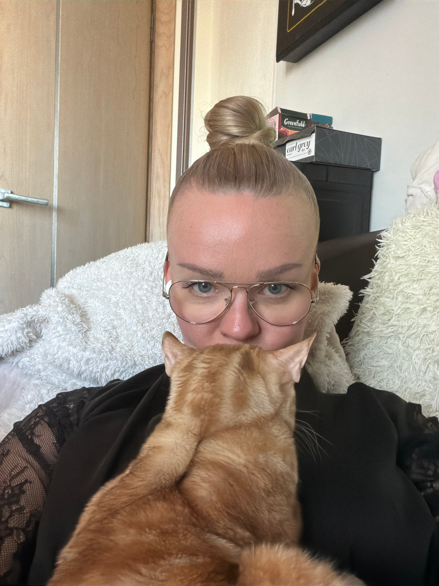 A woman with blonde hair in a bun and wearing round glasses is holding an orange tabby cat close to her face. The cat is nuzzling her. She is wearing a black top with lace detailing. There is a fuzzy…read more