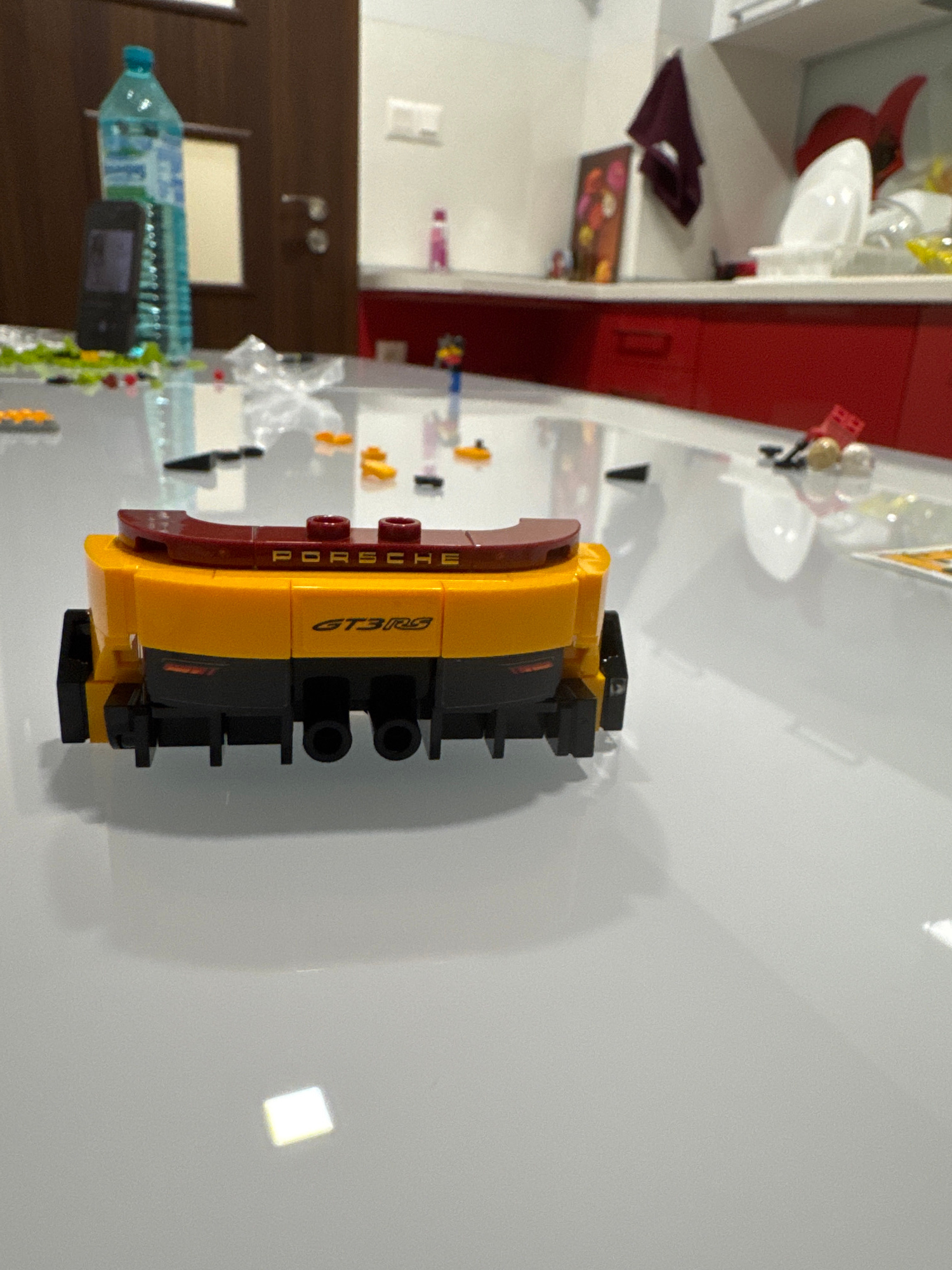 The image shows a Lego Porsche 911 GT3 RS toy car on a white, reflective surface, likely a table. The car is constructed from yellow, black, and red Lego bricks. The word "PORSCHE" is printed vertical…read more