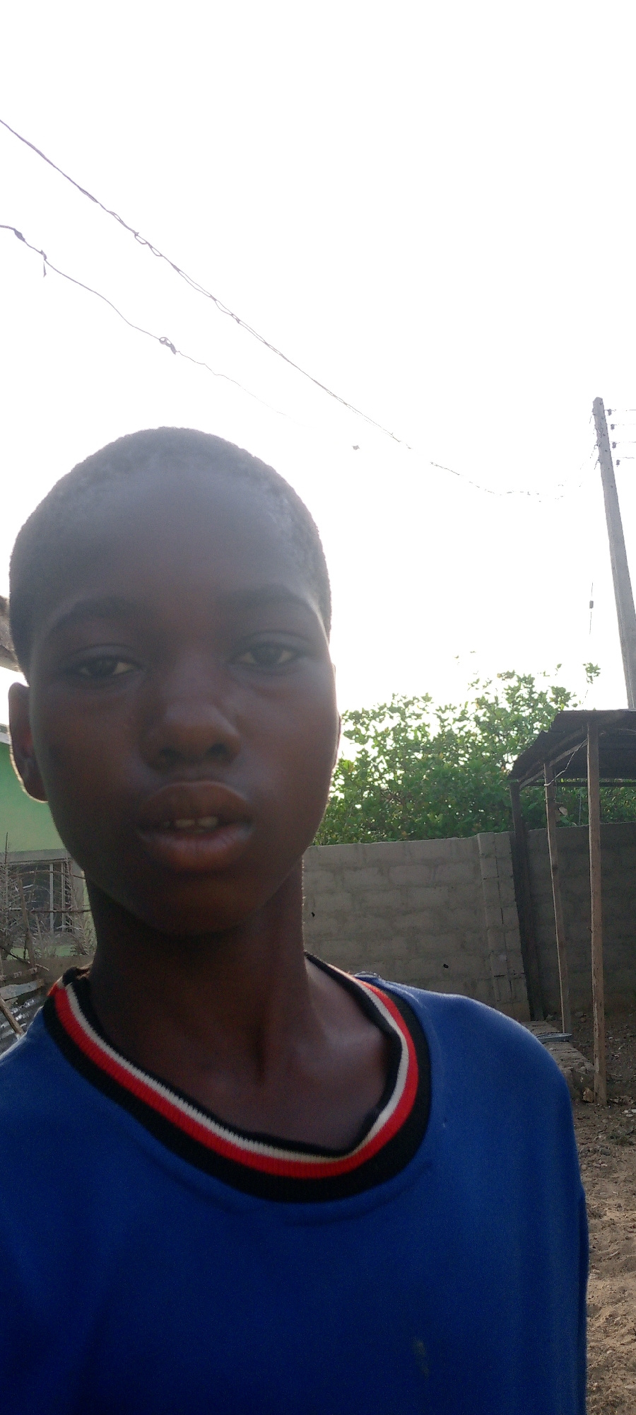 A close-up shot of a young Black male in Adankolo, Nigeria, wearing a blue shirt with a black, red, and white striped collar. A cinder block wall and green foliage are visible in the background. A woo…read more