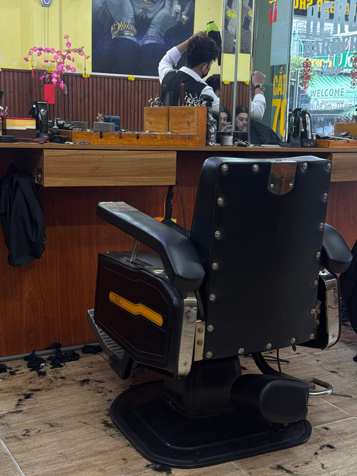 The image depicts the interior of a barber shop located in Nha Trang, Vietnam. The scene is dominated by a large, black, upholstered barber chair with silver stud accents and a prominent yellow "Chất"…read more