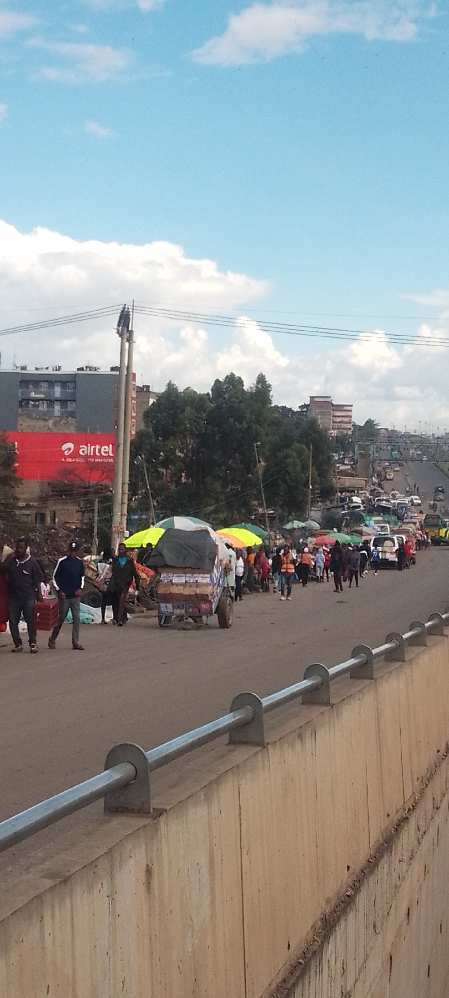 The image depicts a bustling street scene in Nairobi, Kenya. The viewpoint is elevated, looking across a road bordered by a concrete barrier with metal railings. A large red billboard advertising Airt…read more