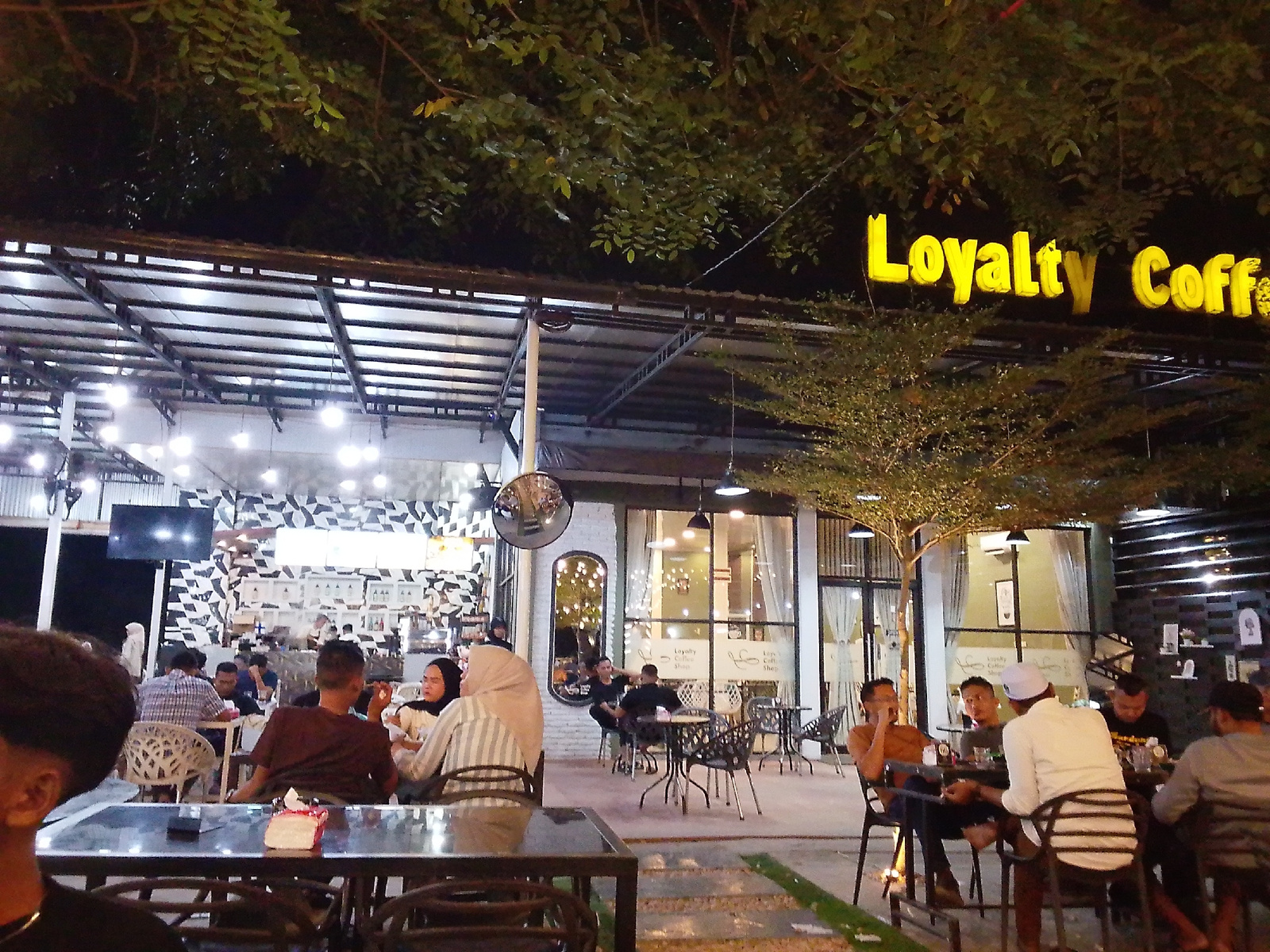 The image depicts an outdoor dining area at "Loyalty Coffee," located in Titibaro, Indonesia. Customers are seated at various tables, engaged in conversation. The establishment is open, with a partial…read more