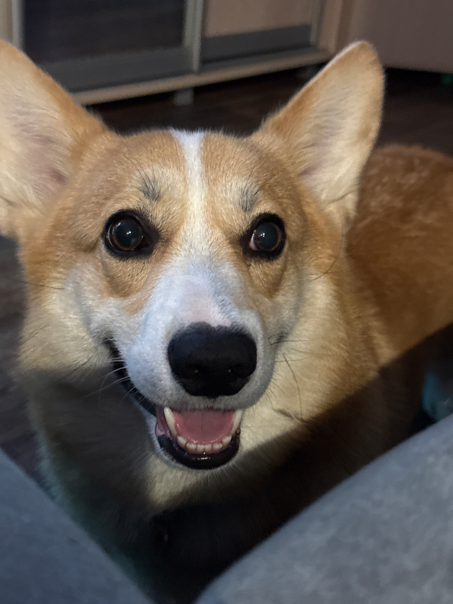 A close-up, slightly off-center, upward-facing portrait of a tan and white corgi dog is presented. The dog's face fills much of the frame; the focus is on its eyes, nose, and mouth. The dog has erect…read more