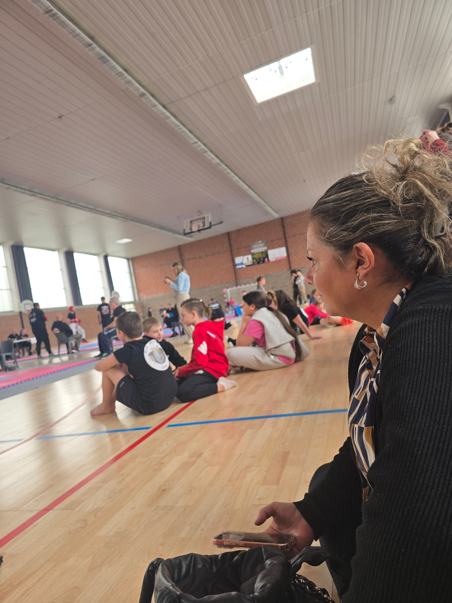 A woman with curly hair and a dark sweater stands near a group of children kneeling on a wooden floor marked with red and blue lines. She holds a phone in her hand. The children, wearing various color…read more