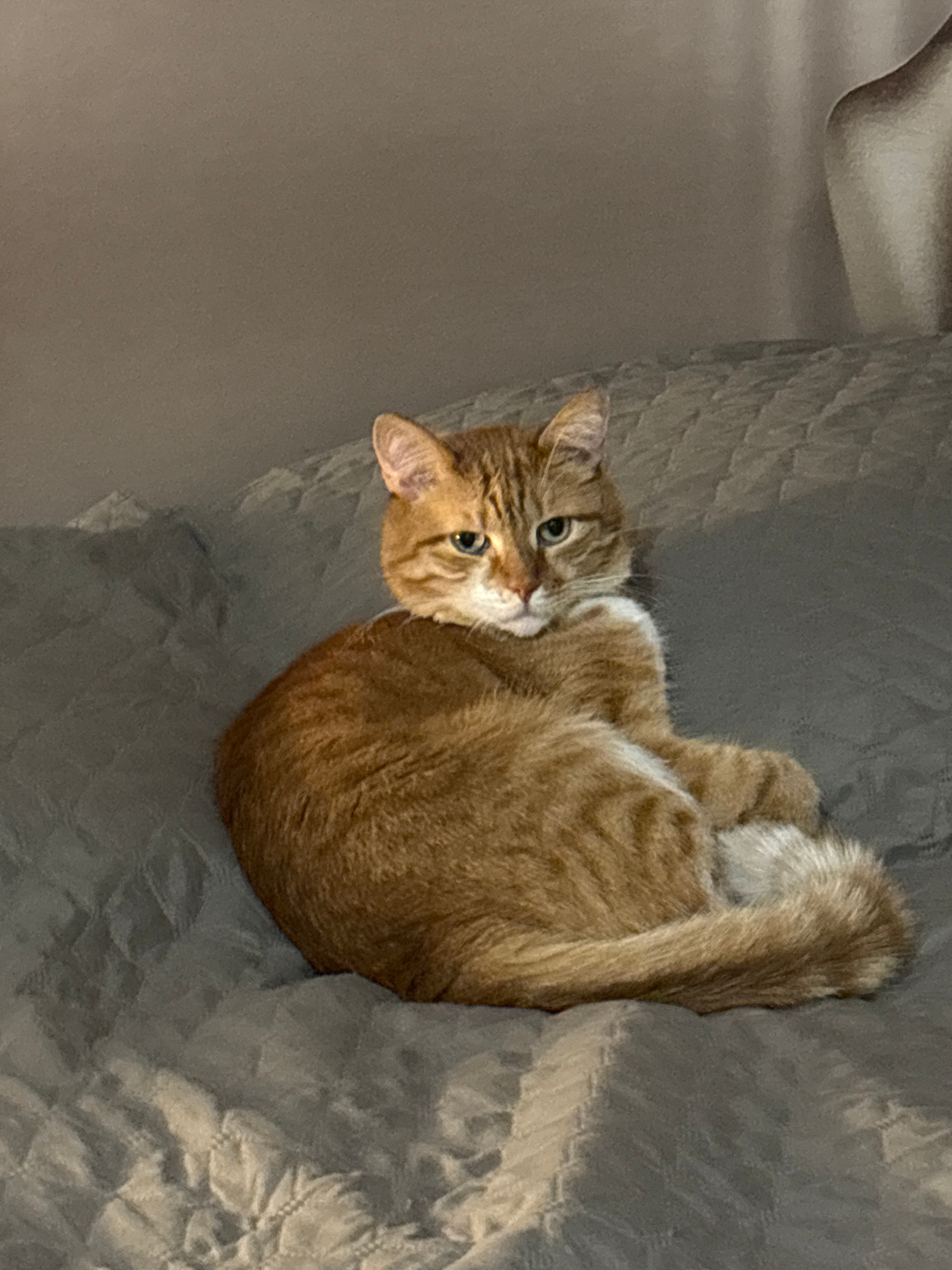 An orange tabby cat lies curled on a gray quilted blanket. The cat's head is tilted towards the viewer, with its eyes open. The cat's tail is curled around its body. The blanket has a textured, quilte…read more