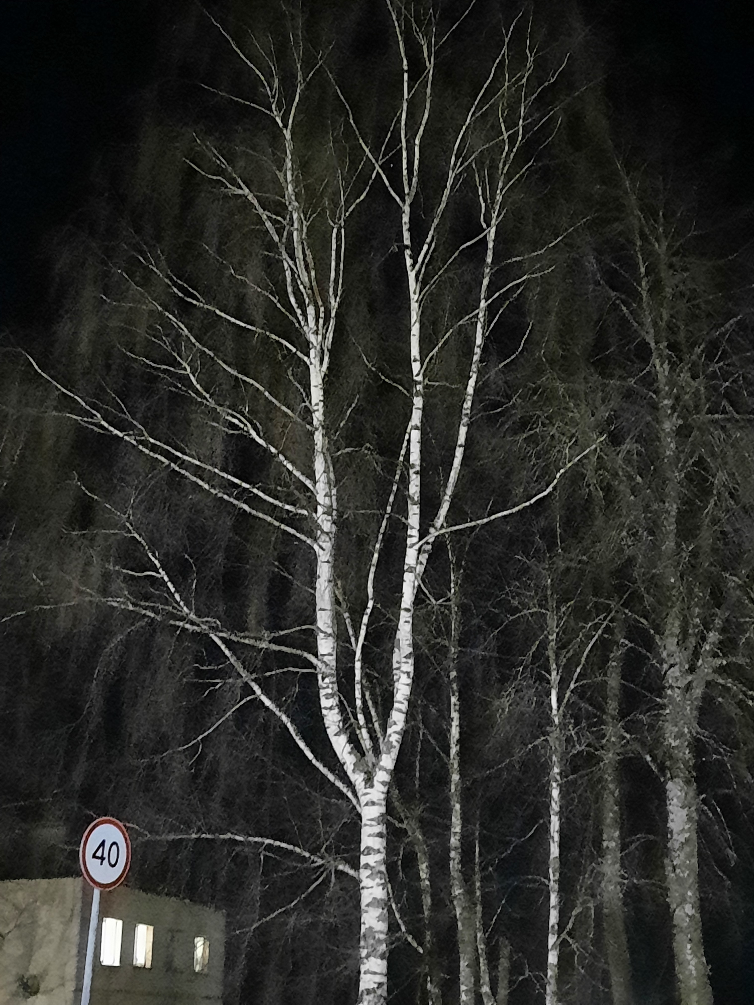The image shows a nighttime scene with bare tree branches in the foreground. A speed limit sign with the number "40" is visible in the lower right corner, partially obscured by branches. Behind the si…read more