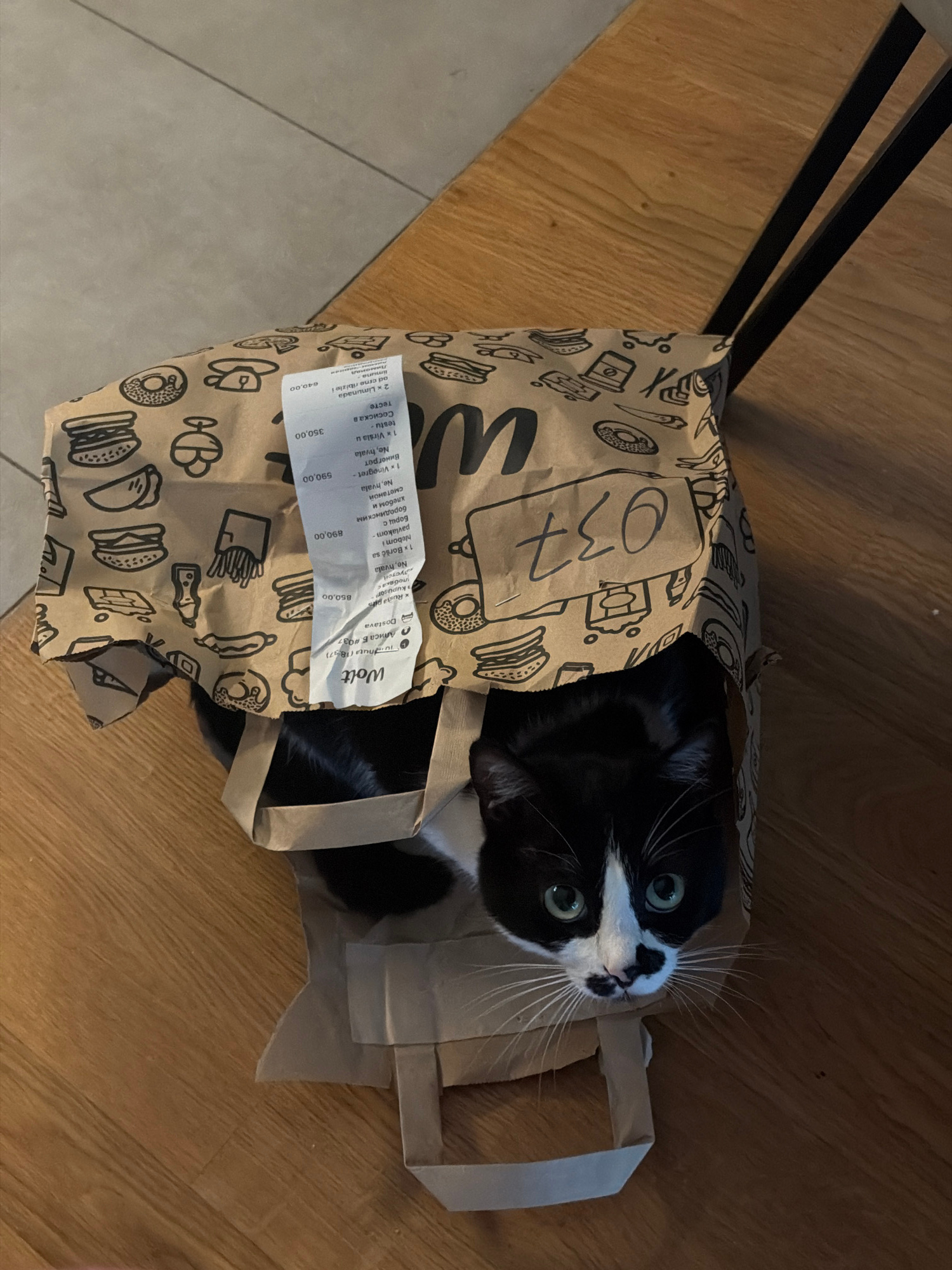 A curious black and white tuxedo cat peeks out from inside a brown paper delivery bag, its bright green eyes looking directly upwards. The cat has prominent white whiskers and a white muzzle, contrast…read more