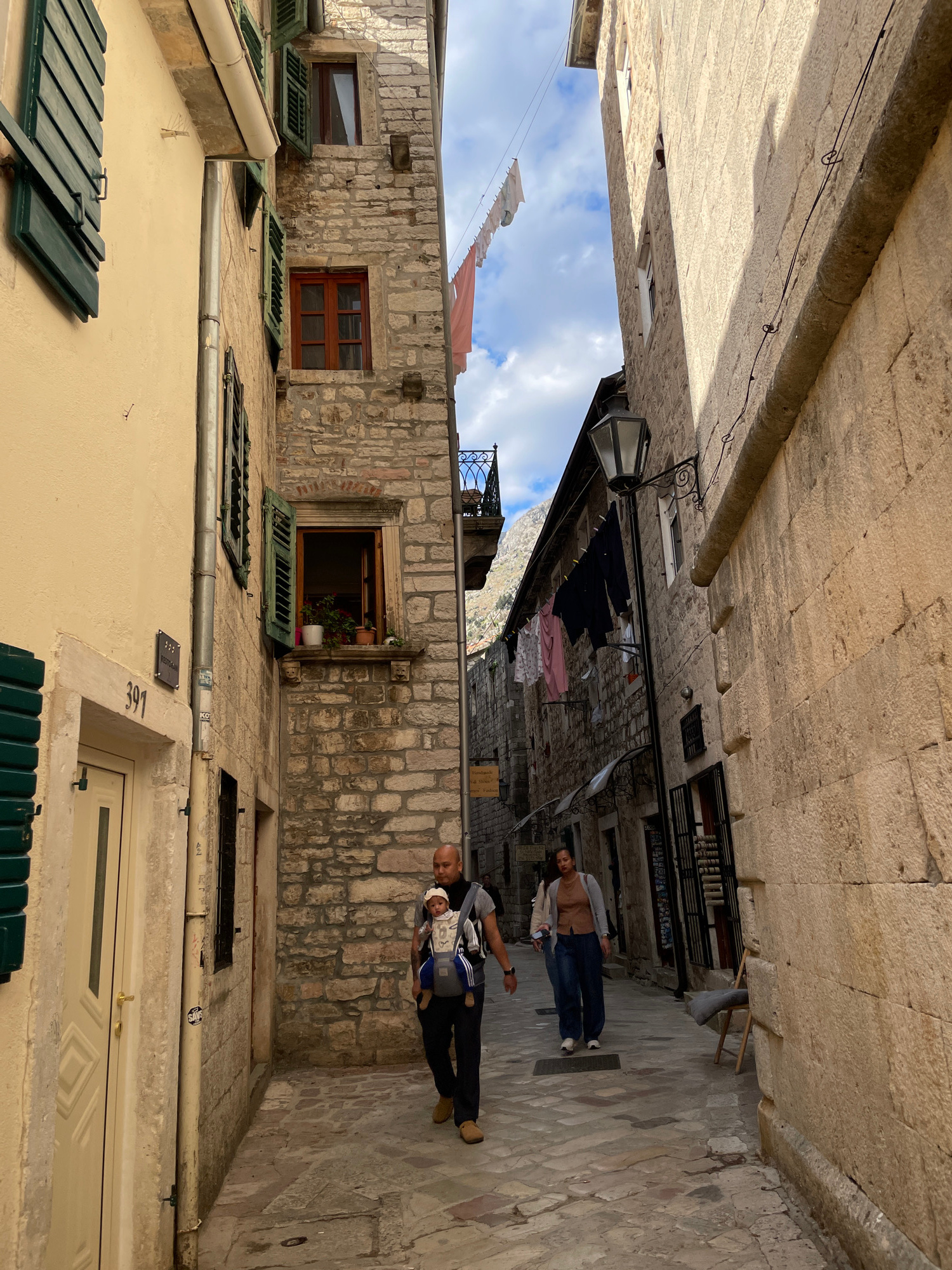 The image shows a narrow street in the city of Kotor, Montenegro. The street is paved with cobblestones and lined with stone buildings. The buildings are old and have wooden shutters on the windows. A…read more