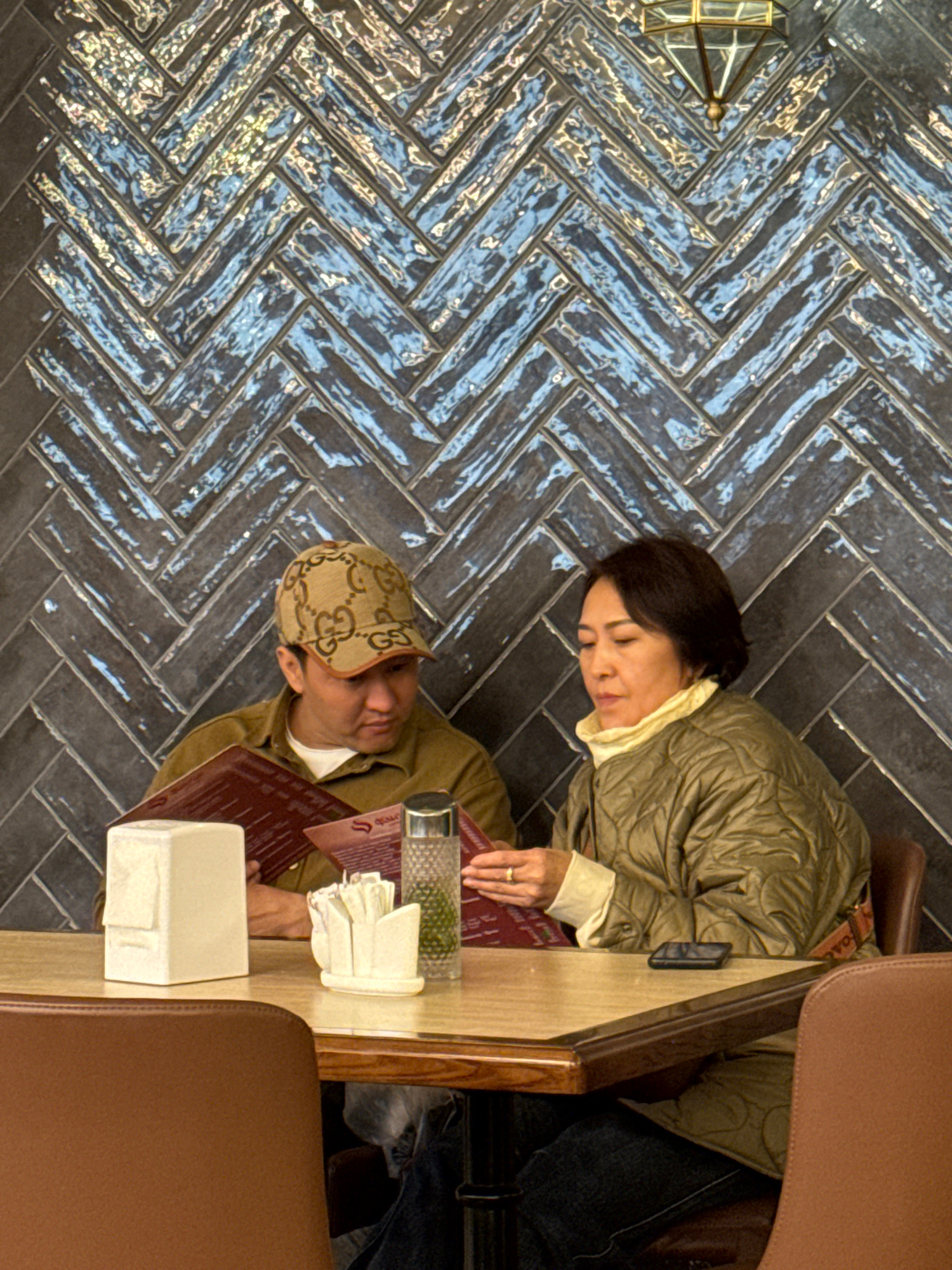 An image captures two individuals seated at a table in what appears to be a cafe or restaurant in Bishkek City, Kyrgyzstan. The photo is rotated 90 degrees clockwise, making the background wall appear…read more