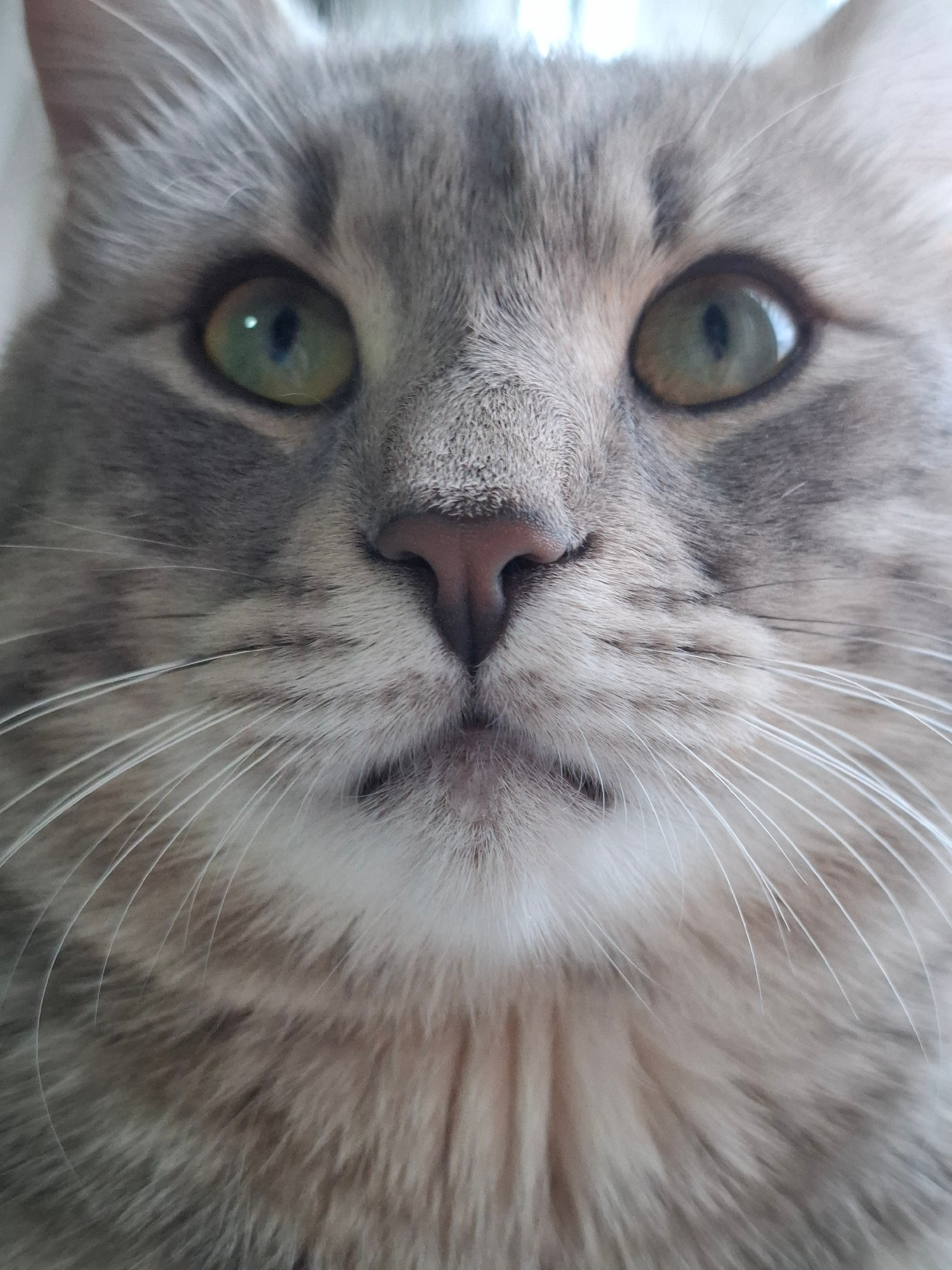 The image shows a close-up of a cat's face. The cat has grey fur, green eyes, and a pink nose. The cat is looking directly at the camera. The image does not provide any information to determine the lo…read more