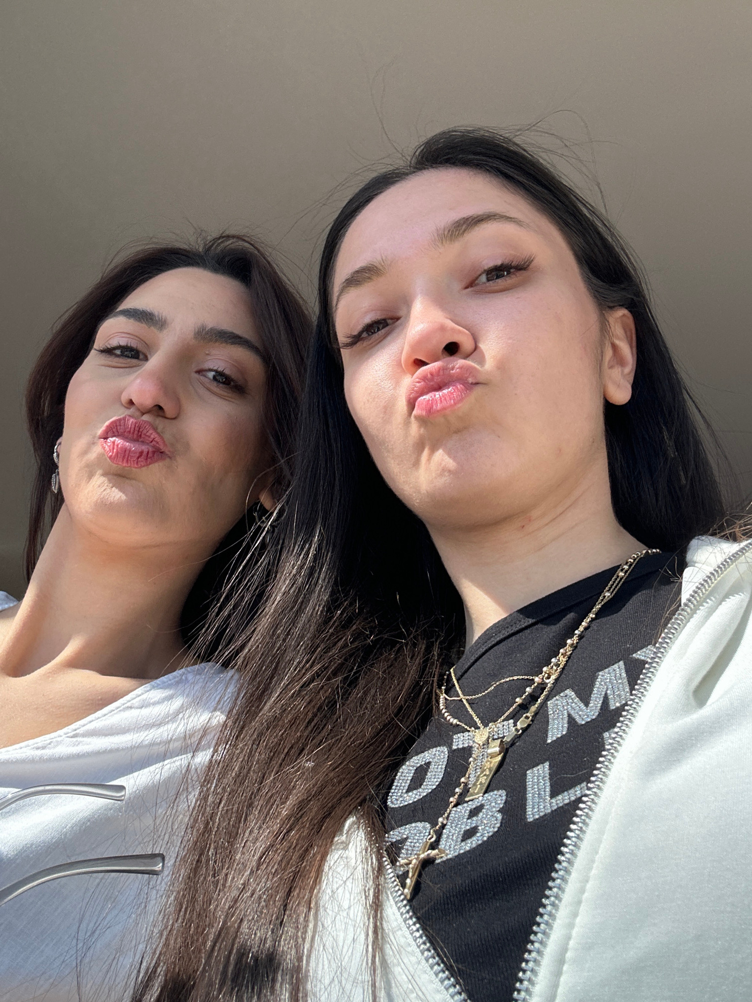 This media file presents a tilted selfie featuring two young women, likely taken indoors in Orgov, Armenia. Both subjects have long, dark hair and are making playful "kissing faces" with puckered, glo…read more
