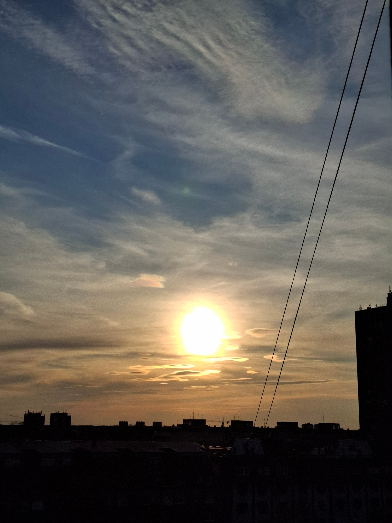 A photograph taken in Novi Sad, Serbia, shows a low-angle perspective of the sky at sunset. The sun, a bright, circular shape, is positioned towards the center-right of the frame. The sky transitions…read more