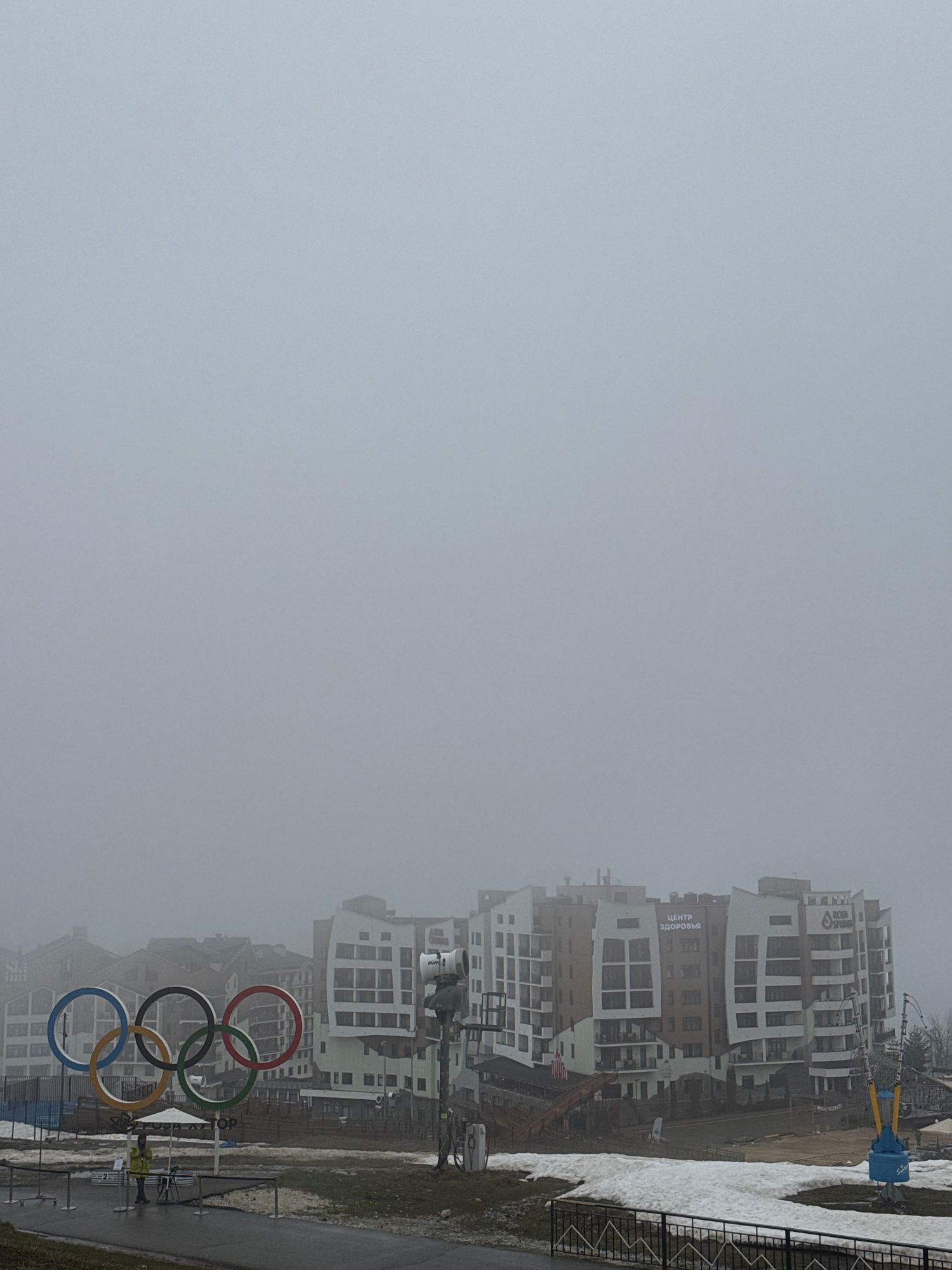 The image shows a hazy view of the Olympic rings in Сочи, Russia, with buildings visible in the background. The rings are in the standard Olympic colors, arranged in the correct order. The buildings i…read more
