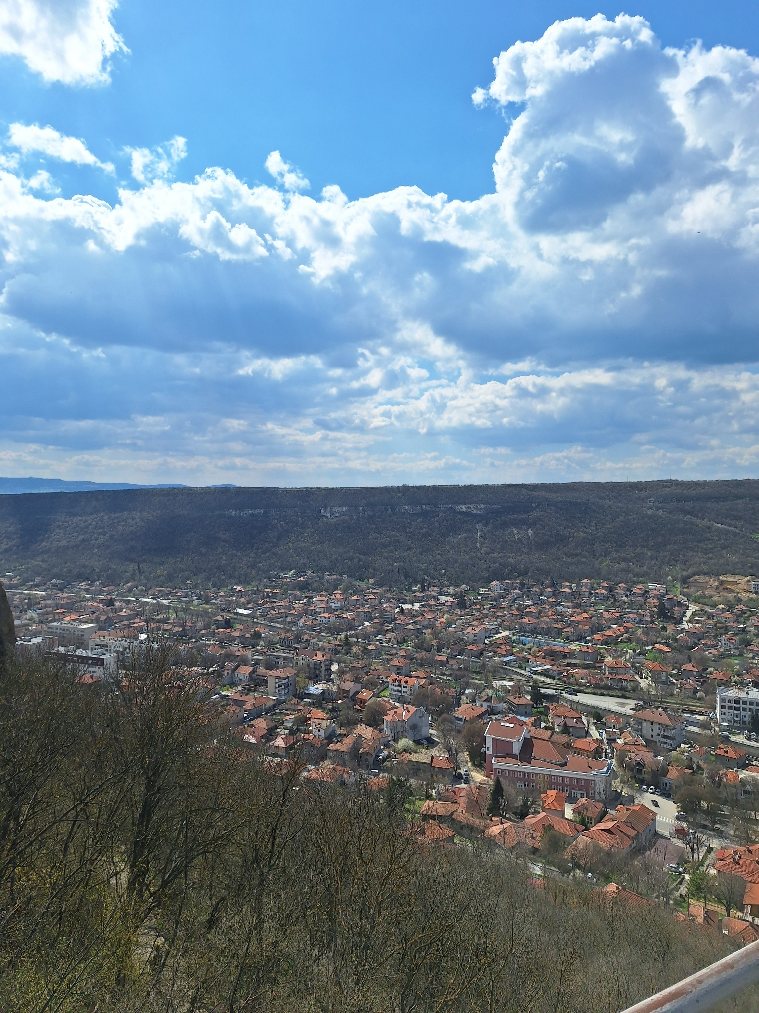 The image shows an aerial view of Provadia, Bulgaria, likely taken from a high vantage point like the Ovech Fortress. The left side of the image features a bright blue sky with scattered cumulus cloud…read more