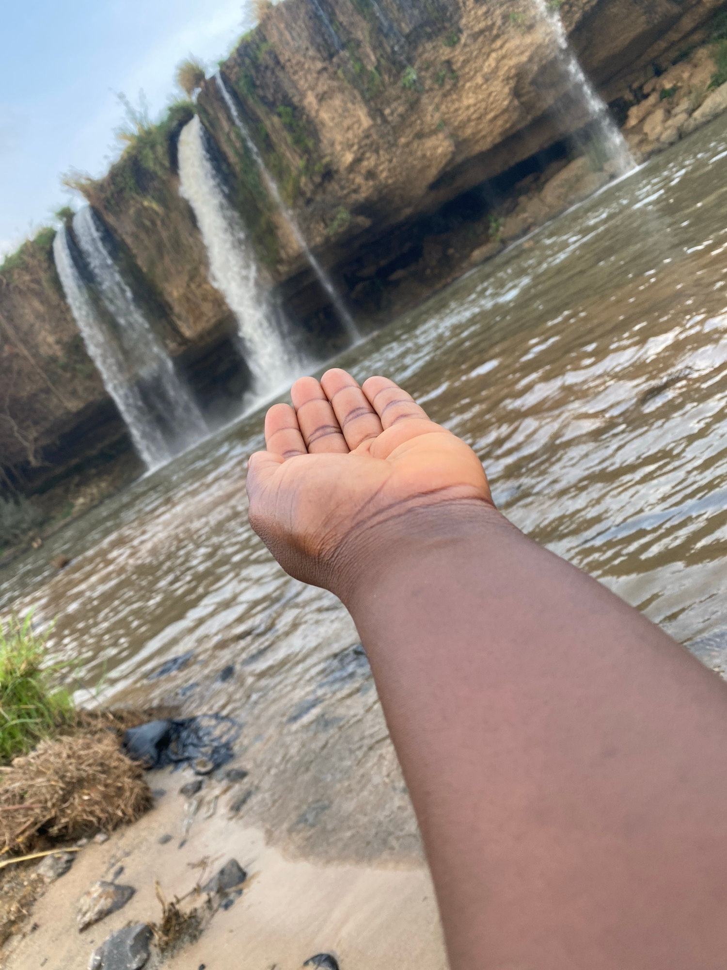 An eye-level shot shows a right human arm and hand extending out toward a waterfall, possibly somewhere in the city of Maigizo, Nigeria. The hand is brown-skinned and open. The arm is in the lower lefβ¦read more