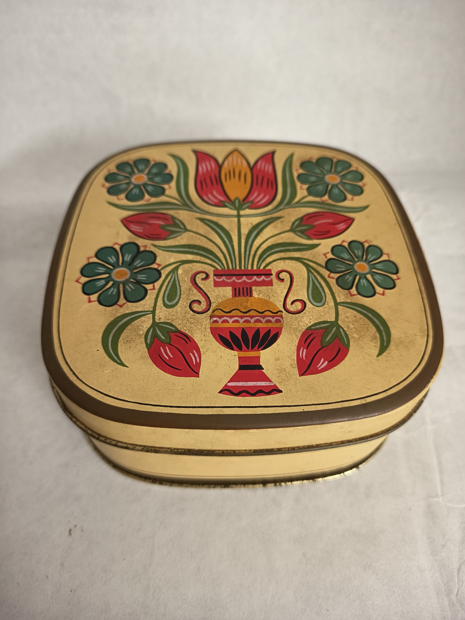 The image shows a decorative tin box with a floral design. The box is rectangular with rounded corners and has a gold-colored background. The design features a vase with flowers in red, orange, green,…read more