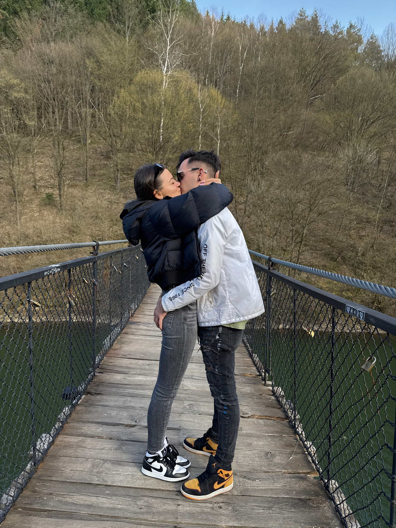 A couple is kissing on a wooden suspension bridge in Dolni Pasarel, Bulgaria. The woman has dark hair and is wearing a black puffer jacket and grey jeans. The man has dark hair, glasses, a white jacke…read more