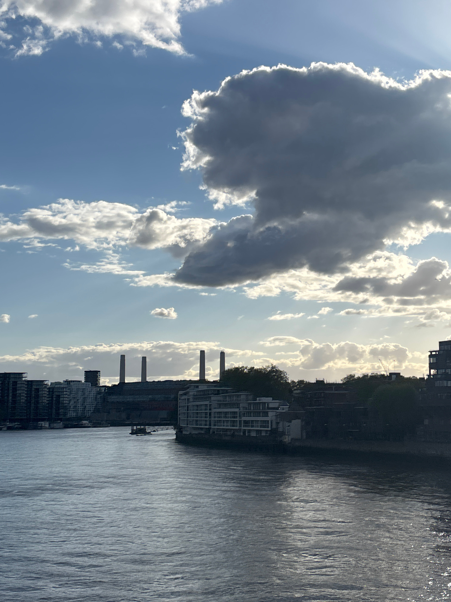 The image shows a view of the River Thames in London, United Kingdom, on a partly cloudy day. The Battersea Power Station is visible with its four chimneys, surrounded by modern buildings. The river i…read more