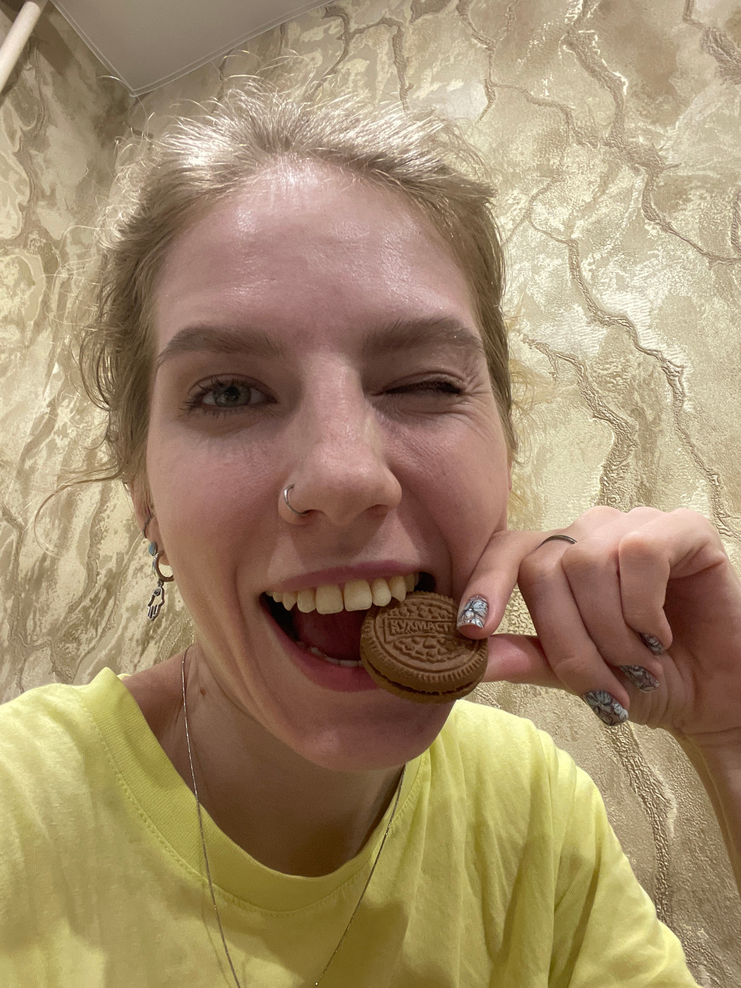 A woman with blonde hair is holding a brown cookie between her fingers, in front of her mouth. She is wearing a yellow shirt. She has a nose piercing and earrings. Her nails are painted with a floral…read more