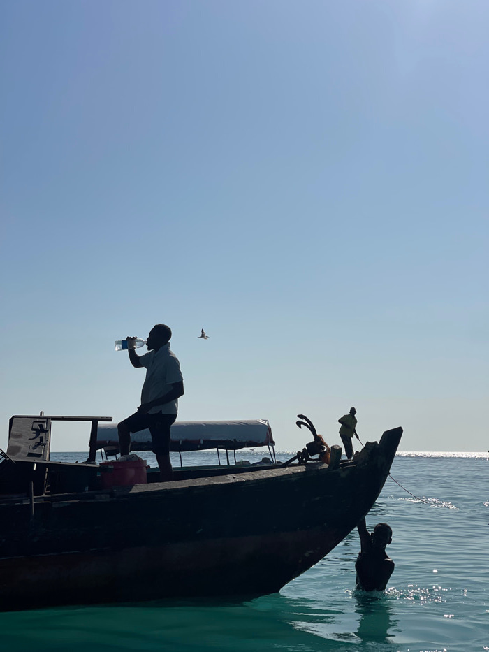 This image depicts a marine scene in the city of Zanzibar, Tanzania, under clear skies. A dark-hulled wooden boat, possibly a traditional dhow, is partially visible, floating in light blue-green water…read more
