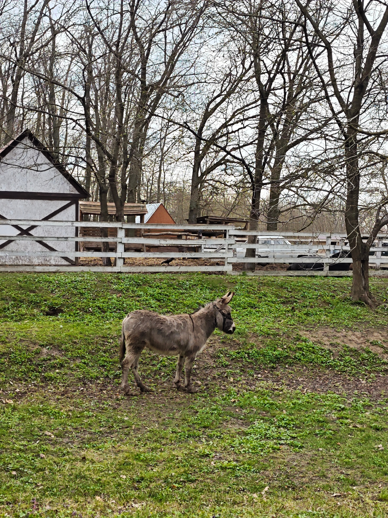The image shows a donkey standing in a grassy field. Behind it, there's a white fence bordering an enclosure with farm structures and bare trees in the background. The location is consistent with a ru…read more