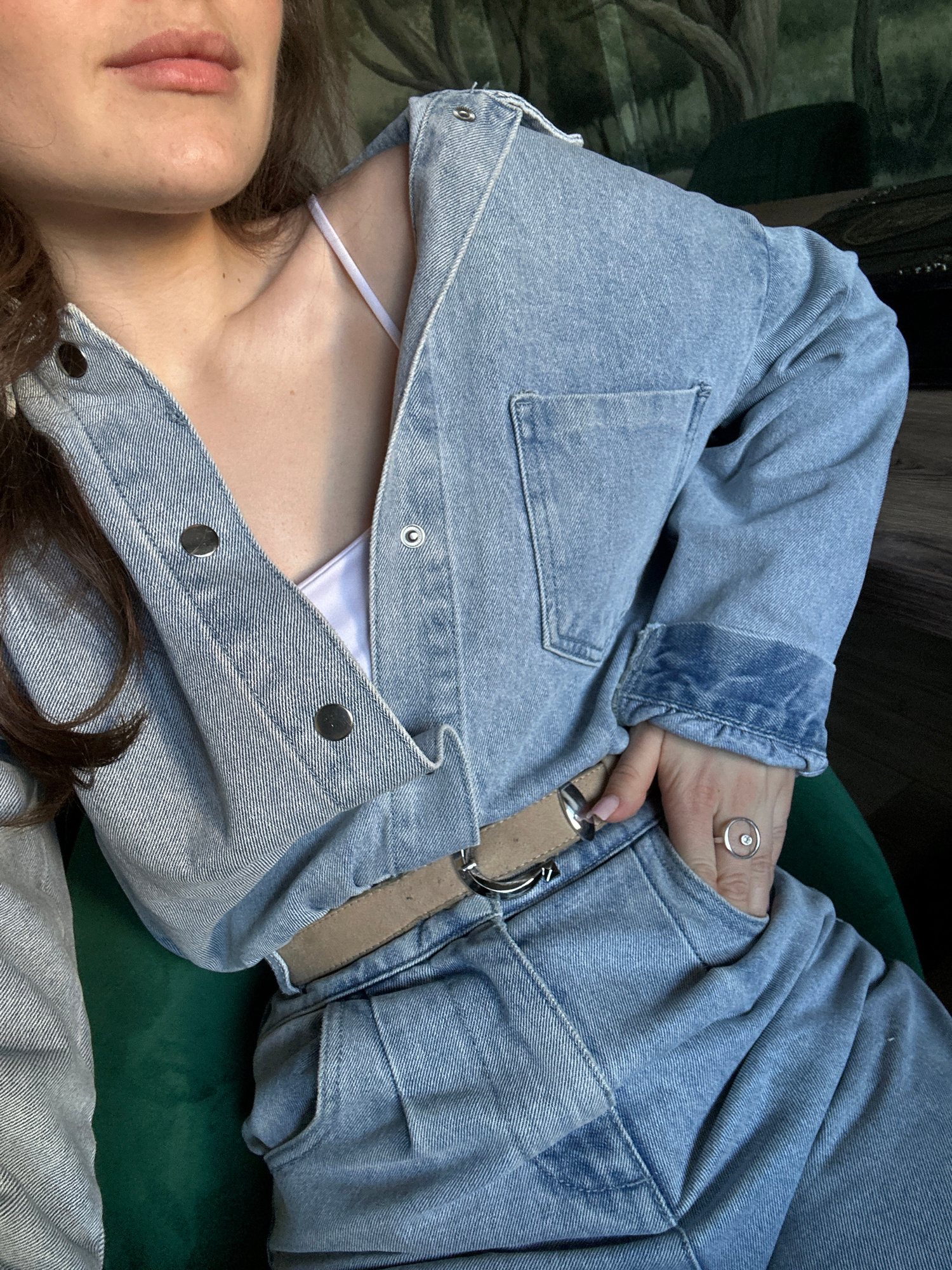 An overhead, close-up shot captures a person reclining indoors on a dark green upholstered surface, possibly a couch. The subject, likely female, is partially visible, showing the side of their face fâŚread more