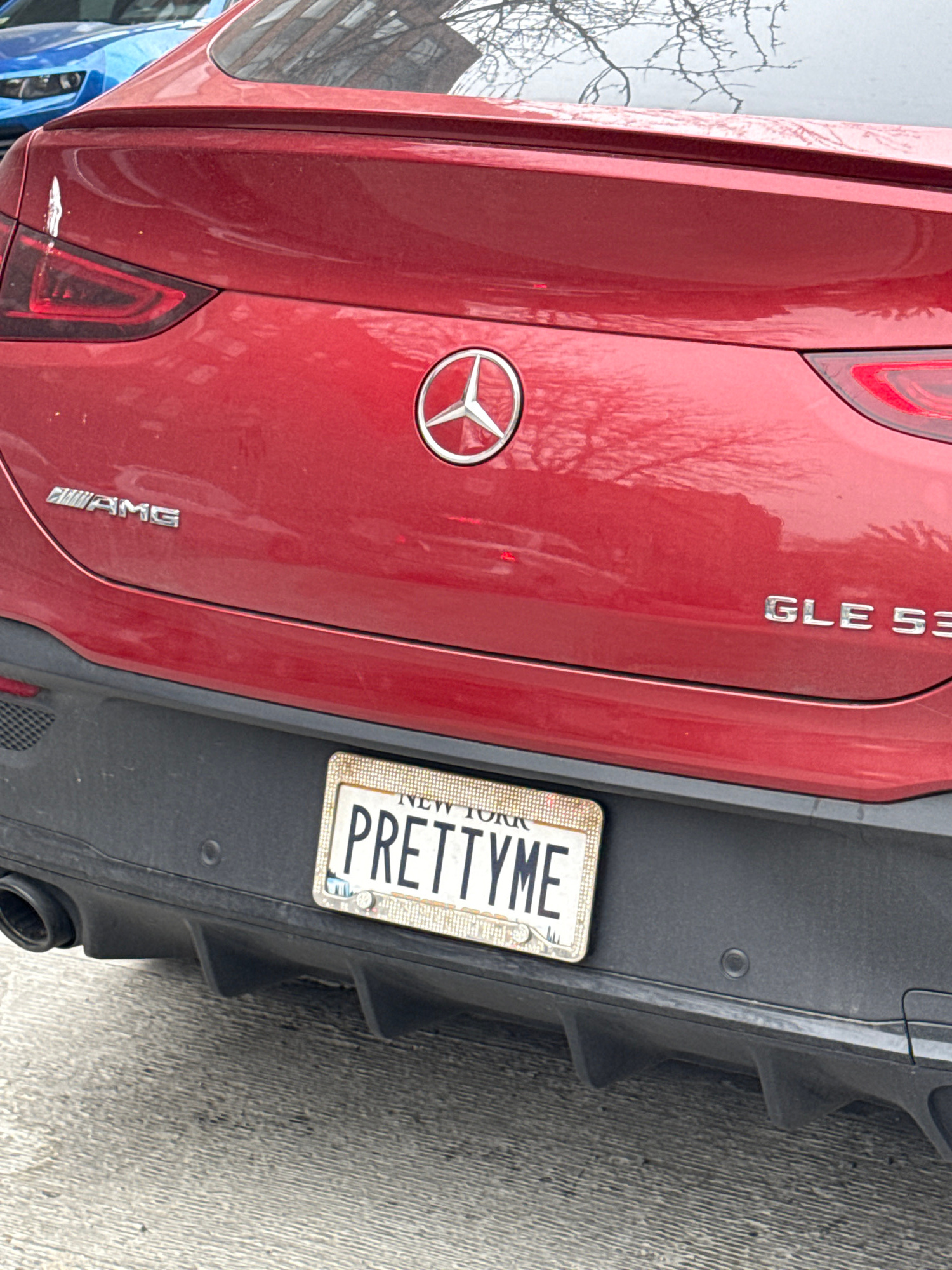 The image shows the rear of a red Mercedes-Benz GLE 53 AMG parked on a street. The car has a New York license plate with the personalized text "PRETTYME". The car's AMG badging and Mercedes-Benz emble…read more