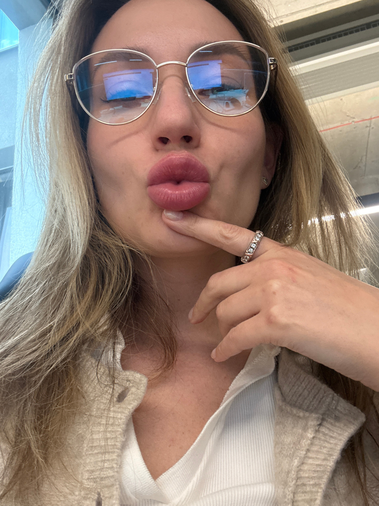 A woman with blonde hair is wearing glasses and a ring. She is making a duck face while holding a finger under her lip. The background is blurry and suggests an indoor setting. There is no way to veri…read more