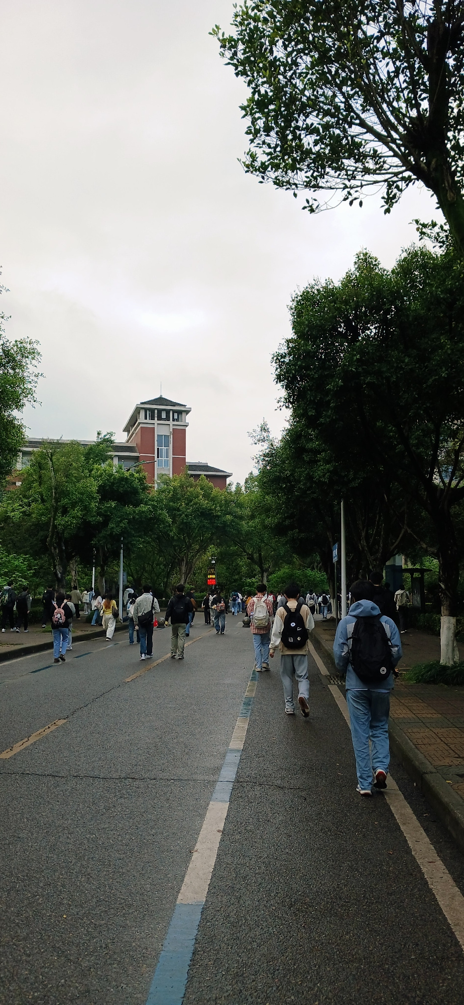 A tilted, low-angle shot depicts a scene in Chongqing High-tech Zone, China. A group of people walks along a road lined with green trees and foliage. The road appears to be paved with asphalt and feat…read more