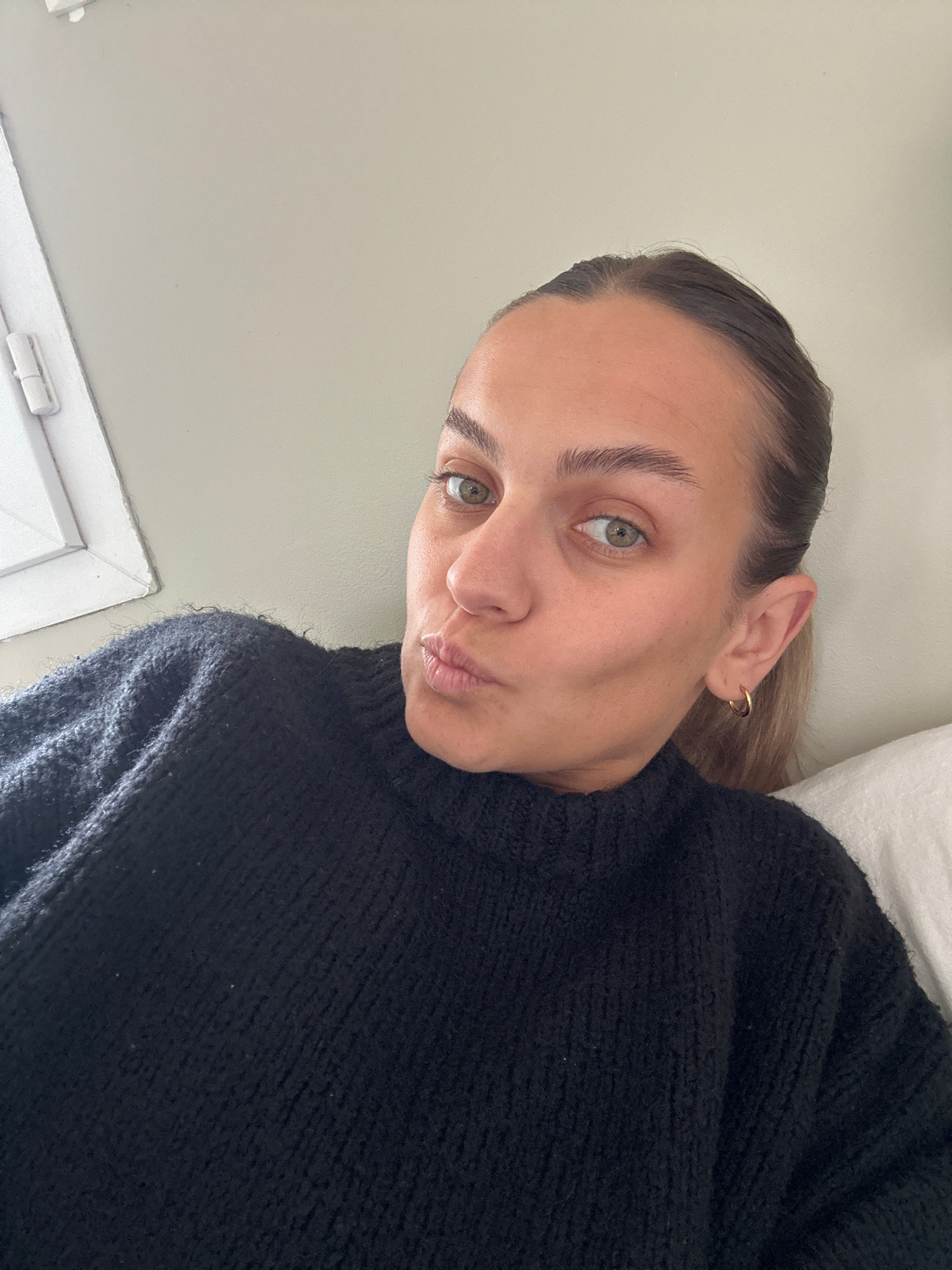 A close-up, low-angle shot depicts a person with fair skin, light brown hair pulled back, and green eyes. They are wearing a black, knit sweater and a small gold hoop earring in their left ear. The ba…read more