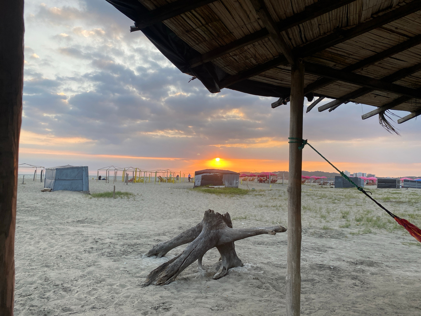 The image captures a sunset view from under a thatched roof structure on the beach of General Villamil Playas, Ecuador. The sun is setting on the horizon, partially obscured by clouds. The beach is sandy with scattered patches of grass and driftwood. Several small structures or beach huts are visible in the distance, along with beach furniture like chairs and umbrellas. A large piece of driftwood resembling a tree stump sits prominently in the foreground. To the left and right, wooden posts frame the view, suggesting the perspective is from within a sheltered area. A hammock is partially visible on the right side of the frame. | Open Wire