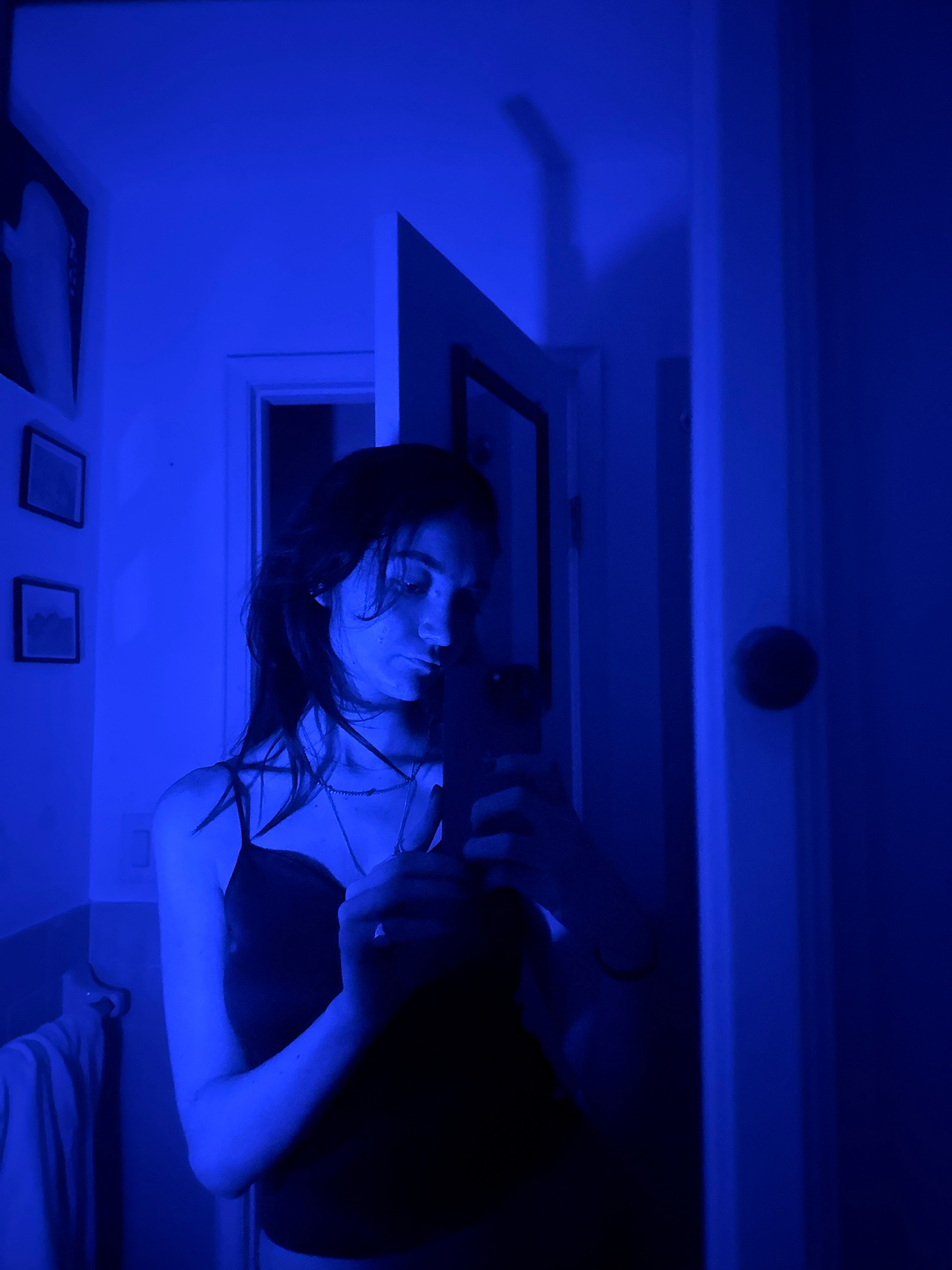 The image captures a person, appearing to be a young woman with long dark hair, indoors under pervasive, deep blue lighting. The entire scene is bathed in a strong, monochromatic blue, creating a cool…read more
