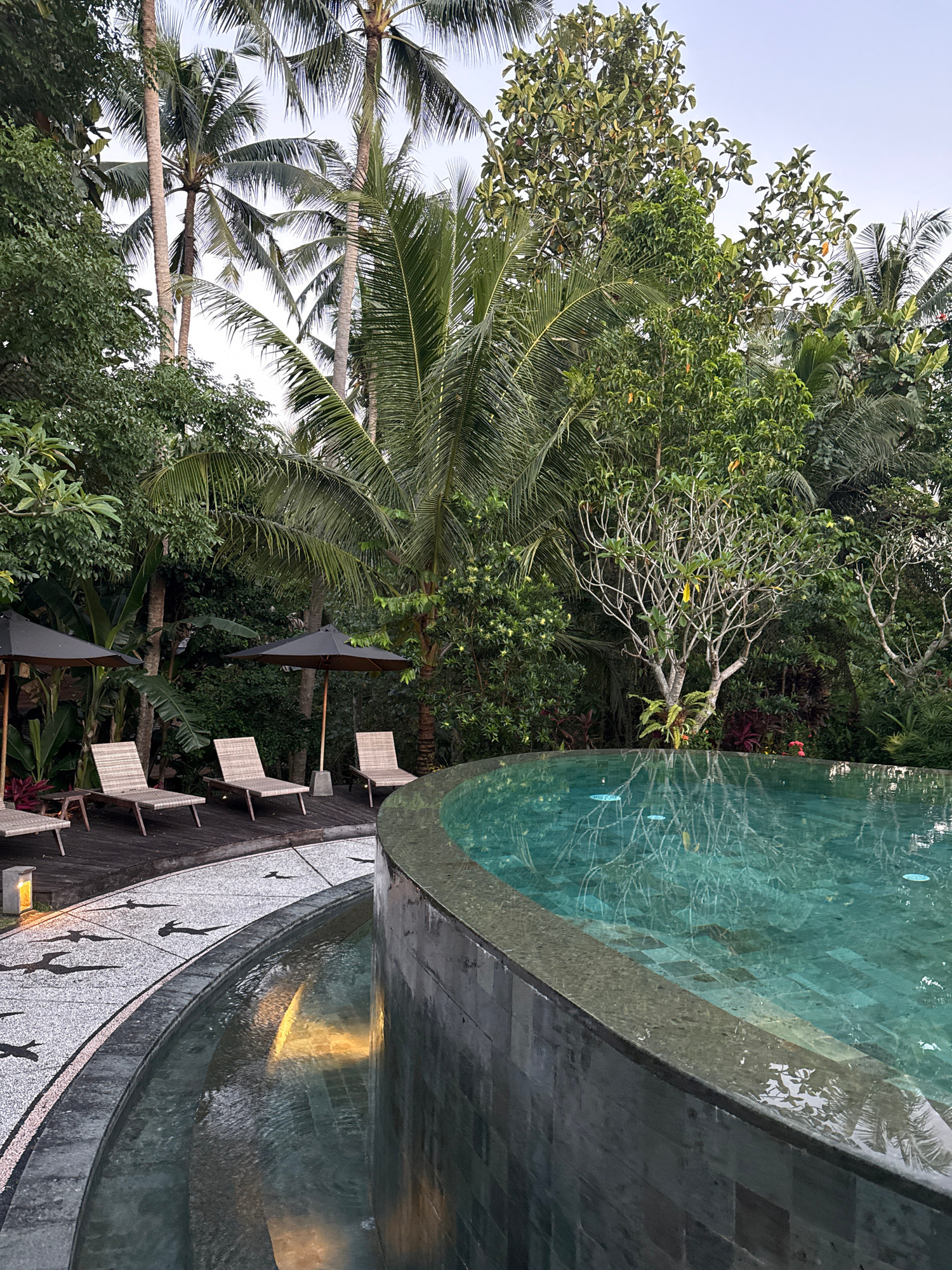 This image captures a serene, upscale outdoor setting, characteristic of a tropical resort or hotel in the Ubud District, Indonesia. The scene is dominated by a beautifully designed, curved swimming p…read more