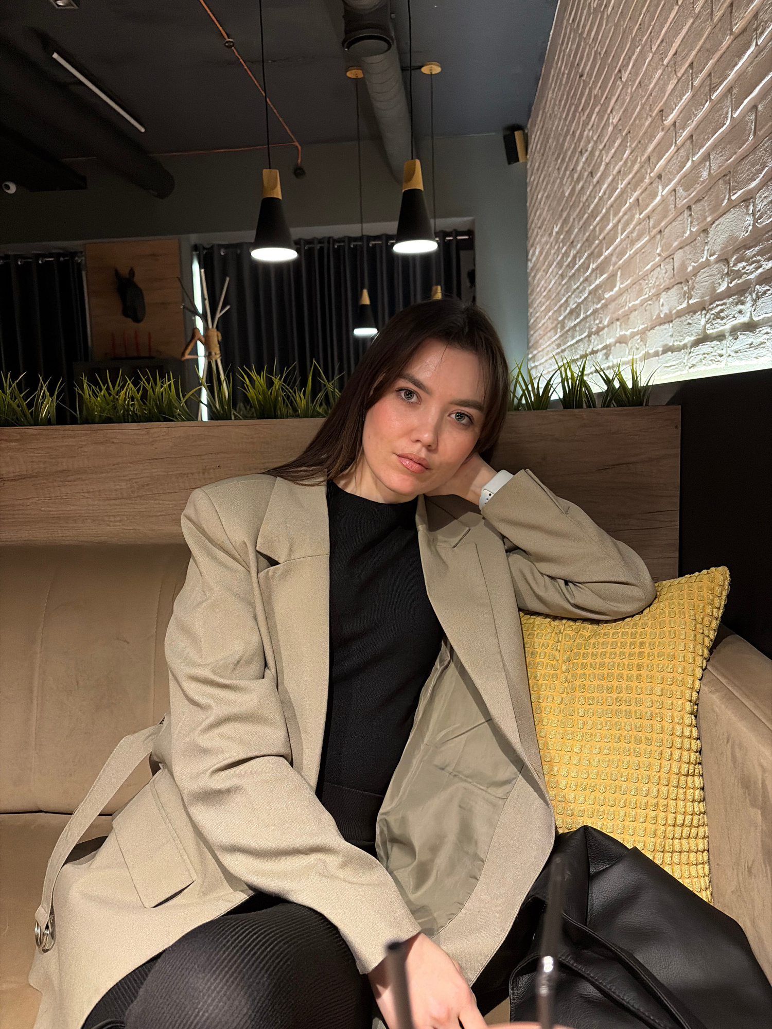 The image depicts a woman in a beige trench coat and black top, seated on a beige couch with a yellow pillow. A black handbag is also present. The background features a brick wall, hanging lights, and…read more