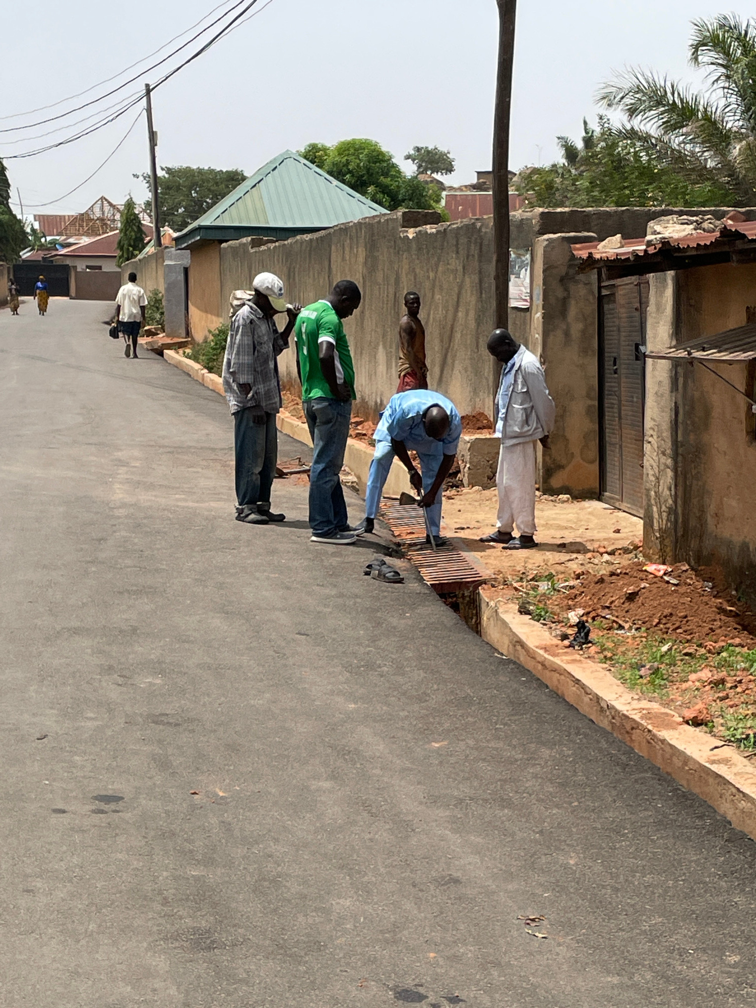 The image shows a street scene in Jos, Nigeria. The street is paved and lined with buildings of varying construction. At least eight people are visible, including a group of men standing near the edge…read more