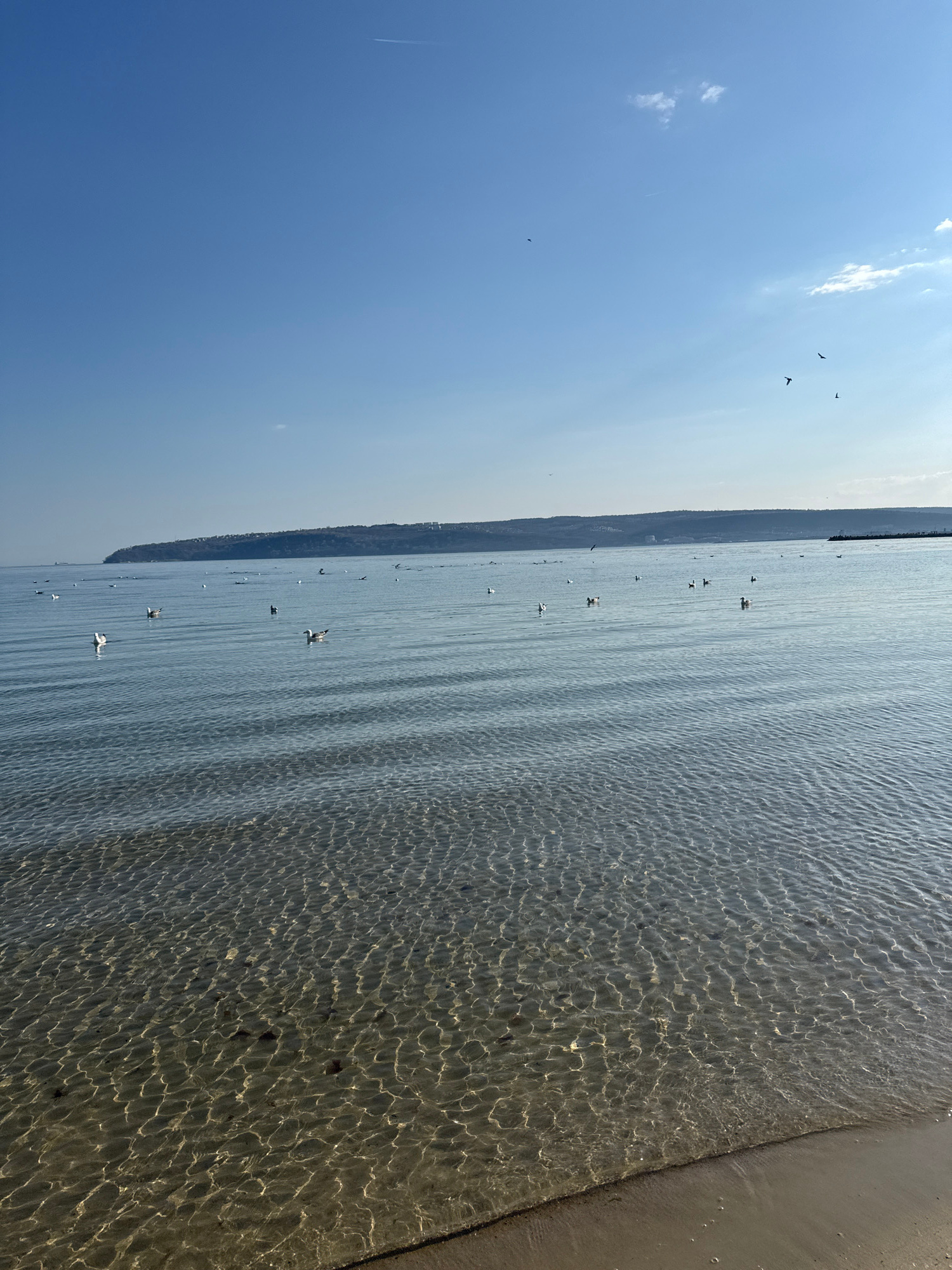 The image shows a beach scene in Varna, Bulgaria. The clear, shallow water meets the sandy shore. In the distance, a forested coastline is visible. Several seagulls are scattered across the water, som…read more