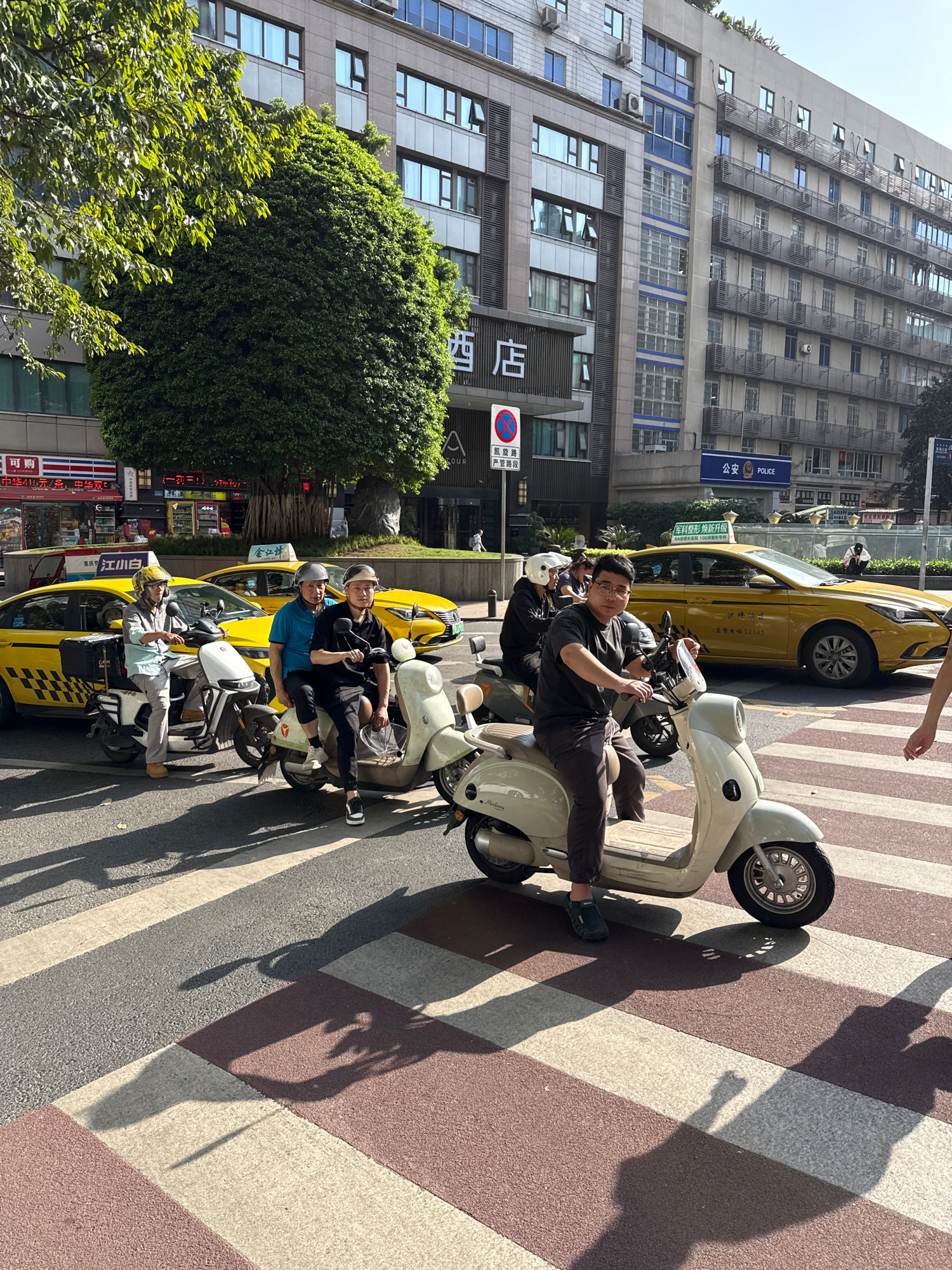 An outdoor, eye-level street view captures a bustling urban scene in Yuzhong District, China, under bright sunlight, indicated by the strong, long shadows cast across a distinctive beige and brown str…read more